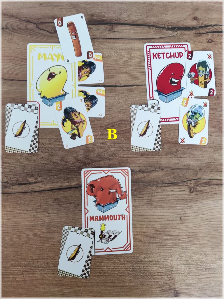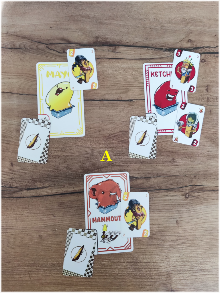 Dans l’exemple B sur la sauce mayo, un joueur à joué une carte fricadelle, il expulse donc la carte frite/mayo de l’autre joueur et récupère les deux cartes frites présentes sous la carte sauce mayo.