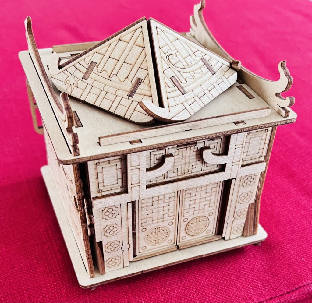 Voici la présentation d’un OLNI (objet ludique non identifié). La première chose qui frappe à l’ouverture de la boîte, c’est la beauté de l’objet en bois. Puis on constate que certains éléments bougent mais ne s’ouvrent pas. Alors on tâtonne, on s’agace parfois et on cherche à ouvrir. Et puis tout d’un coup on se souvient qu’il y a une notice au fond de la boîte ! Elle nous raconte l’histoire de ce puzzle bien spécial et la conclusion retient mon attention : Ensemble on est plus fort. Ok, j’appelle la famille Meeple à la rescousse !