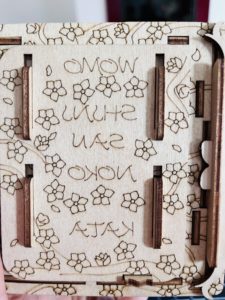 Cet objet est en fait un casse-tête avec des énigmes à résoudre pour réussir à l’ouvrir. Mais que c’est dur !!! Plus d’une fois j’ai eu envie de le faire disparaître dans la cheminée ! Le plus difficile est de trouver par où commencer. On appuie sur des aspérités, on tourne des molettes, on retourne le cube dans tous les sens et rien ne se passe, c’est vraiment frustrant. Tout d’un coup, il y a un machin qui sort sans que l’on comprenne vraiment ce que l’on fait pour cela. Puis on comprend mais ne comptez pas sur moi pour vous dévoiler quoi que ce soit !