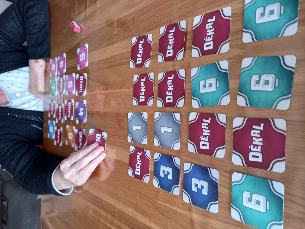 Dans Dekal, création de Gigamic, vous allez poser un tableau de cartes de 4 par 4. C’ est parti pour 16 tours. A votre tour, vous prenez une carte du tableau pour la révéler face visible et la jouer. Le premier joueur, et dans l’ordre du tour, choisi alors de prendre l’une des cartes ainsi révélées au milieu de la table pour la mettre dans son tableau. Mais attention, on ne met pas sa carte n’importe où, le joueur fait glisser les cartes de la ligne ou de la colonne où il a prit la carte qu’il a joué.