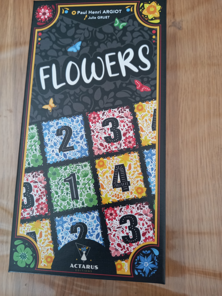 Flowers est le premier jeu d’une nouvelle maison d’édition Actarus et c’est un premier essai réussi. Flowers est un petit jeu de cartes rafraîchissant demandant d’être bien organisé. A son tour, le joueur va piocher une carte parmi 3 cartes (2 faces visibles et une face cachée). Il faudra alors construire son tableau de cartes en faisant se connecter les cartes par groupe d’au moins 5 cartes de la même couleur ou par groupe de valeur. Par exemple une carte de valeur devra se trouver avec 2 et seulement 2 autres cartes de valeur 3.
