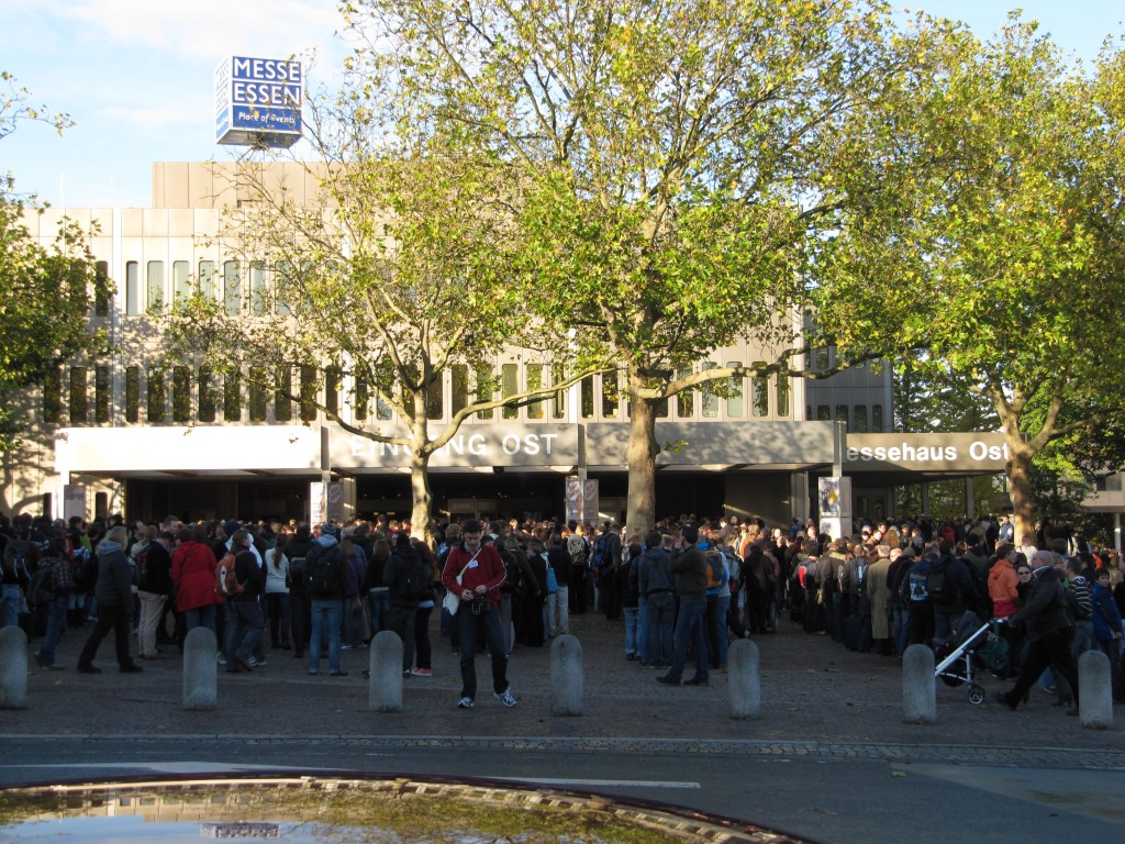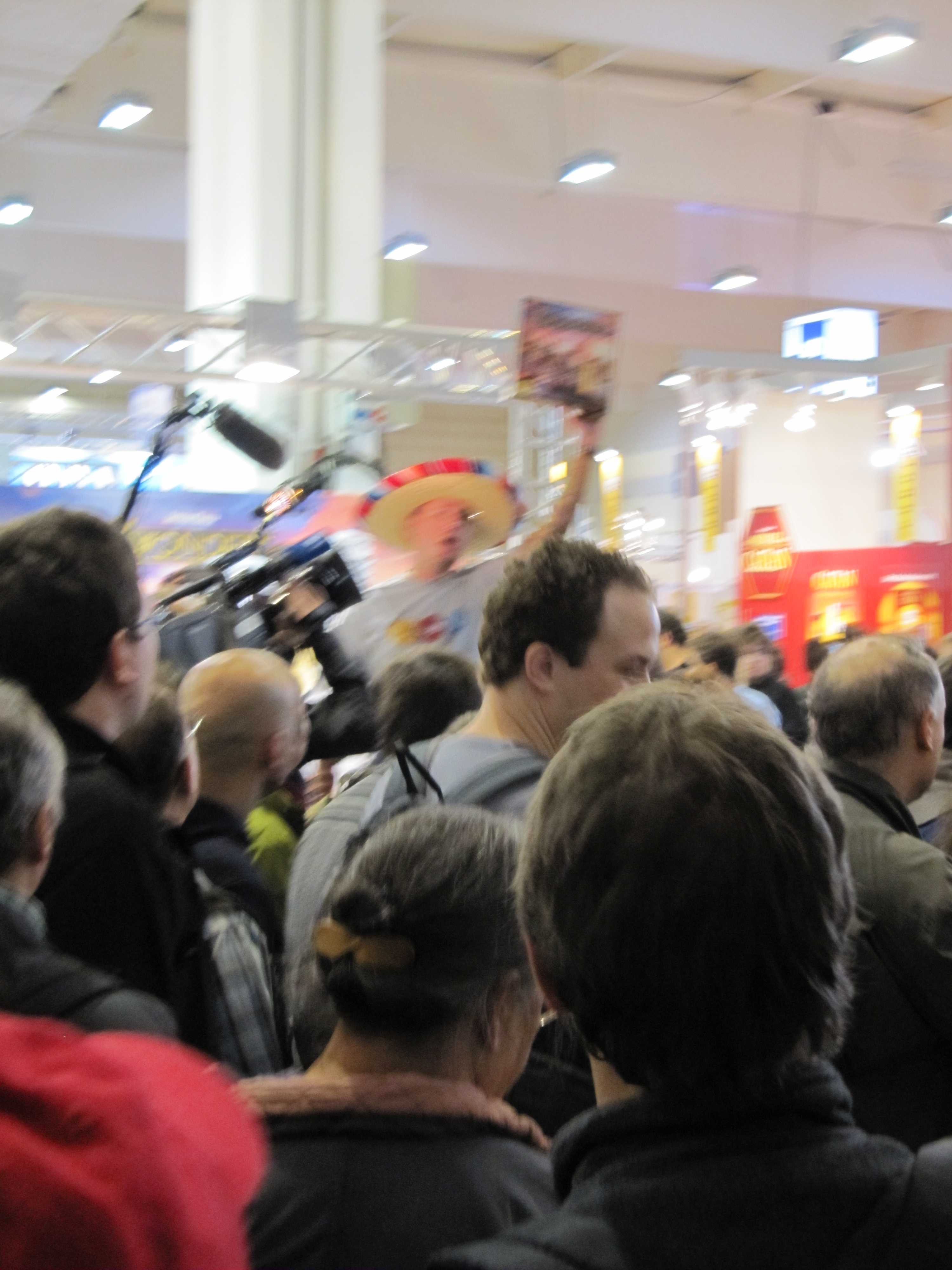 Le jeudi matin, c’est la cohue pour rentrer. Escusez-moi pour la photo floue mais je n’ai pas réussi à en faire une seule nette tellement on était bousculé. Là, vous voyez, à l’entrée du salon, un gars de repos production qui encourage les joueurs à venir tester 7 Wonders. Il ne l’a plus fait très longtemps vu le succès qu’a eu le jeu…