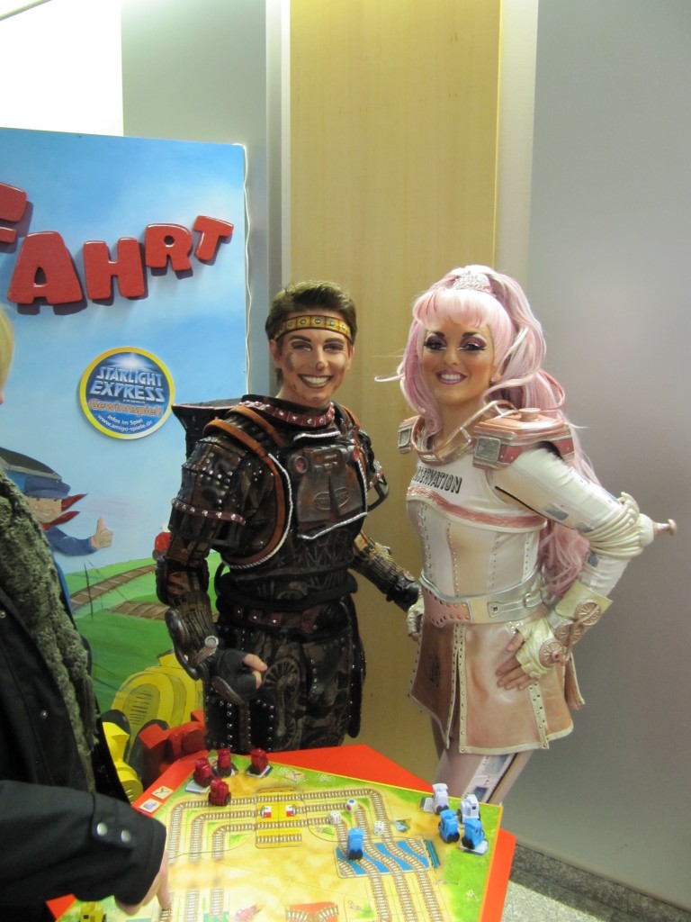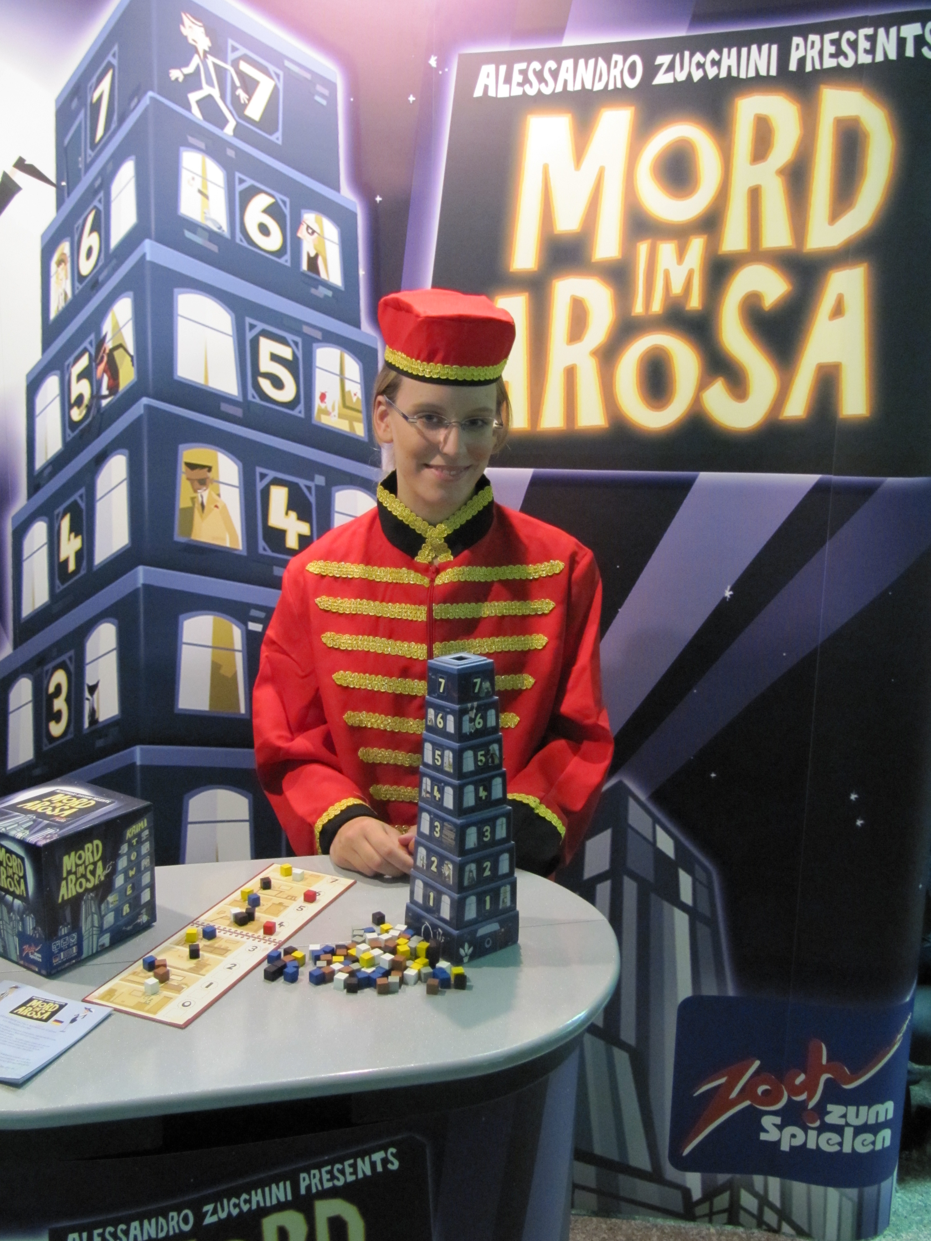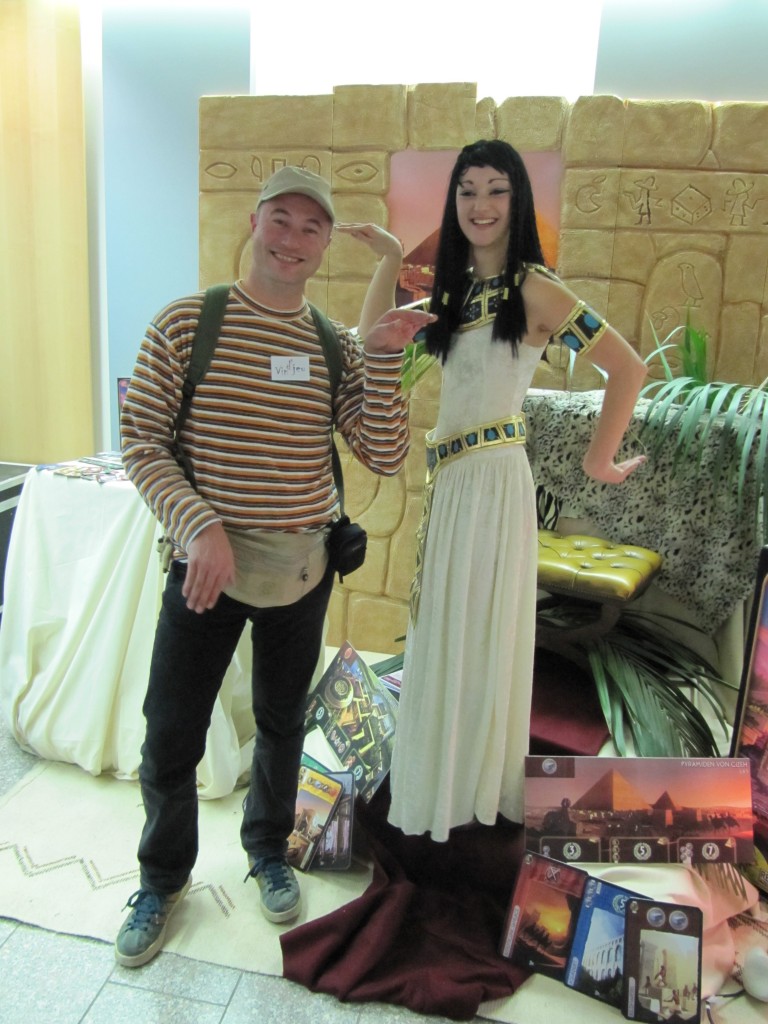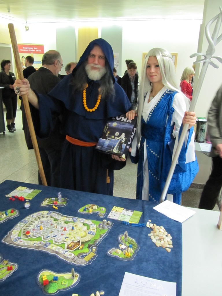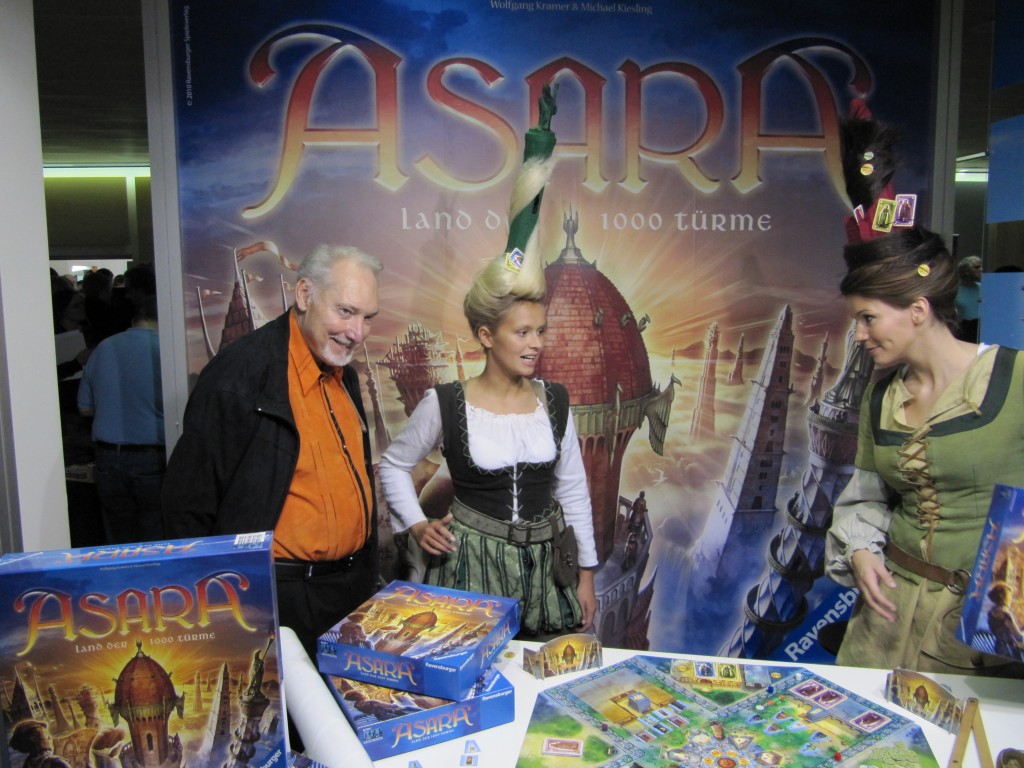 Asara et ses 2 belles hôtesses dont les coiffures épatent accompagnées d’un auteur de génie: Wolfgang Kramer (qui pour la petite histoire s’est vu refuser l’entrée à la conférence de presse car il n’avait pas le fameux pass press! Bravo!)