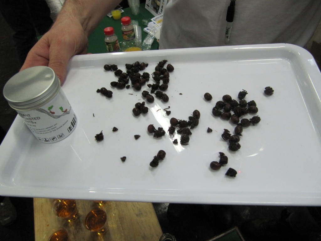 Sur le stand de Antics, un Monsieur bien sympathique habillé en insecte (comment n’ai-je pas fait tilt???) nous proposait un alcool de miel accompagné d’étranges fruits secs. Gourmand comme je suis, j’ai aimablement accepté le verre d’alcool qui a été avalé en moins de 2 puis me suis rué vers ces fruits secs bien alléchants et en ai avalé un directos. Puis, j’y ai regardé de plus près…