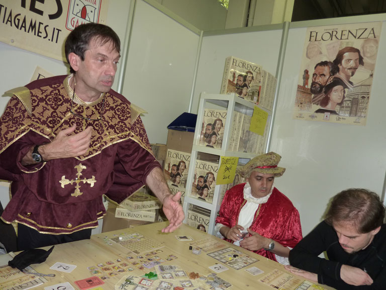 Remarquez que même sur les stands, on s’intègre au jeu. Ici, lors de l’explication des règles de Florenza.