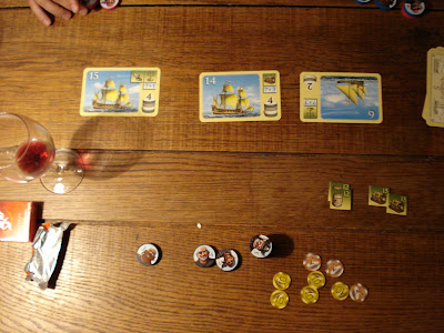 Bucaneer est un jeu pas mal interactif où chacun va recruter un équipage dans les pions disponibles des autres joueurs. Les cartes bateaux au milieu sont des cibles idéales pour nos pirates. Dépendant de la taille des navires, il faudra un équipage plus ou moins important. Le butin est évidemment aussi proportionnel à la taille du bateau.