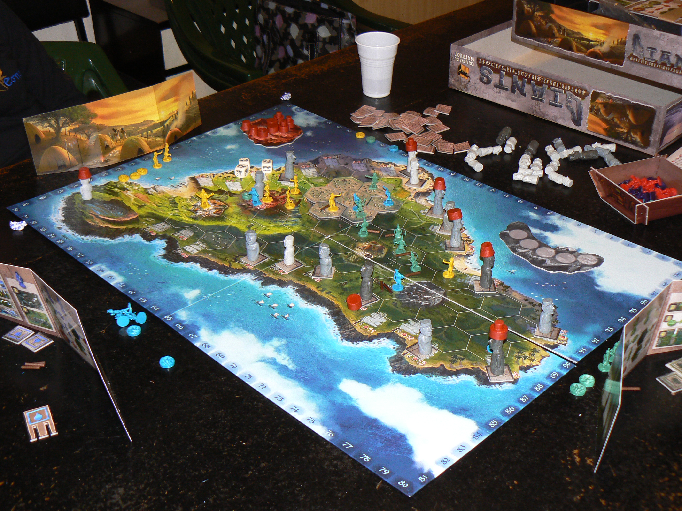 « Les géants de l’île de Pâques » est une véritable claque! Tout d’abord le matériel: le plateau représente très bien la carte de l’île, les Moaïs, les coiffes, les ahus, les sorciers,… sont magnifiques.