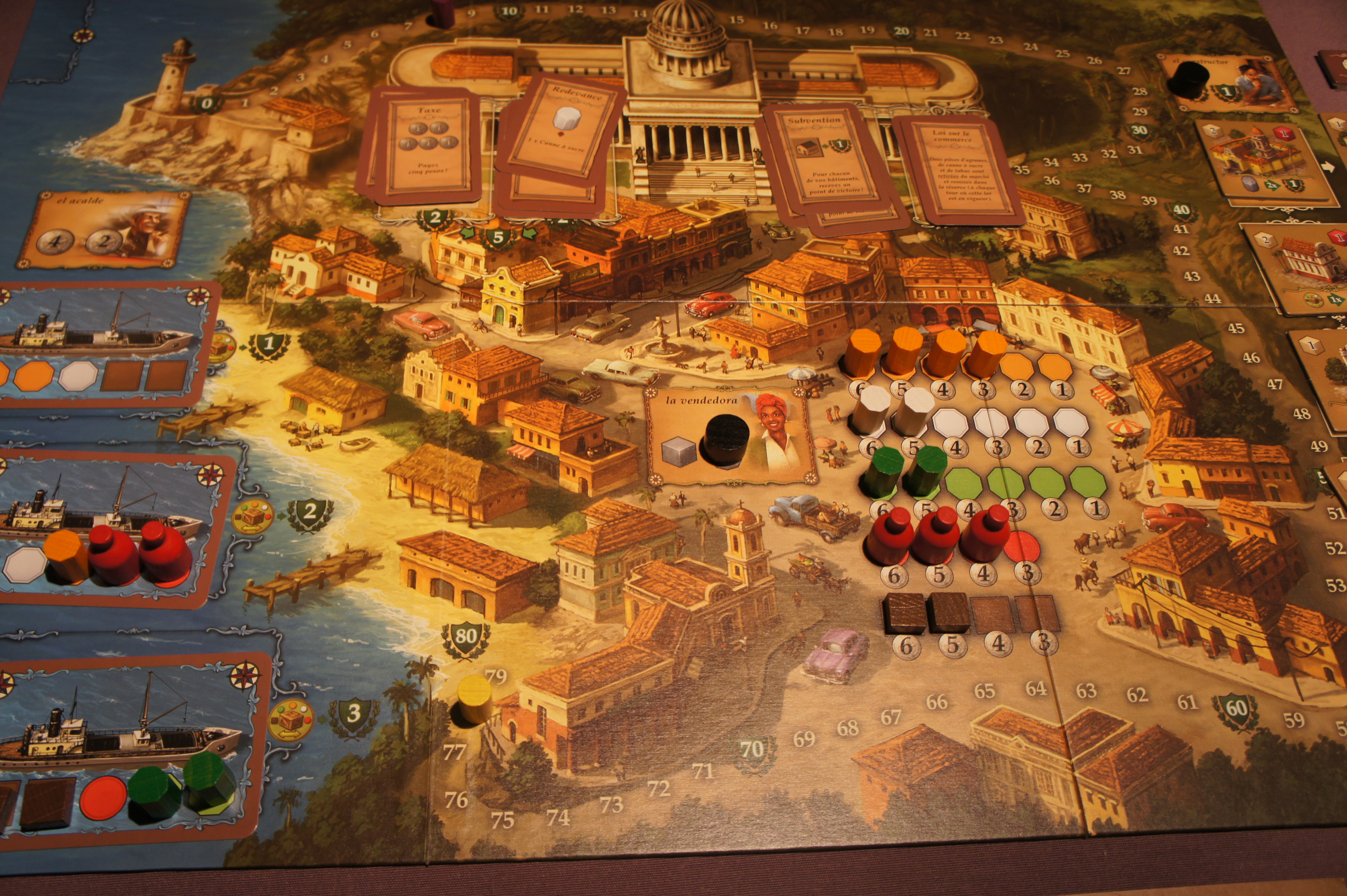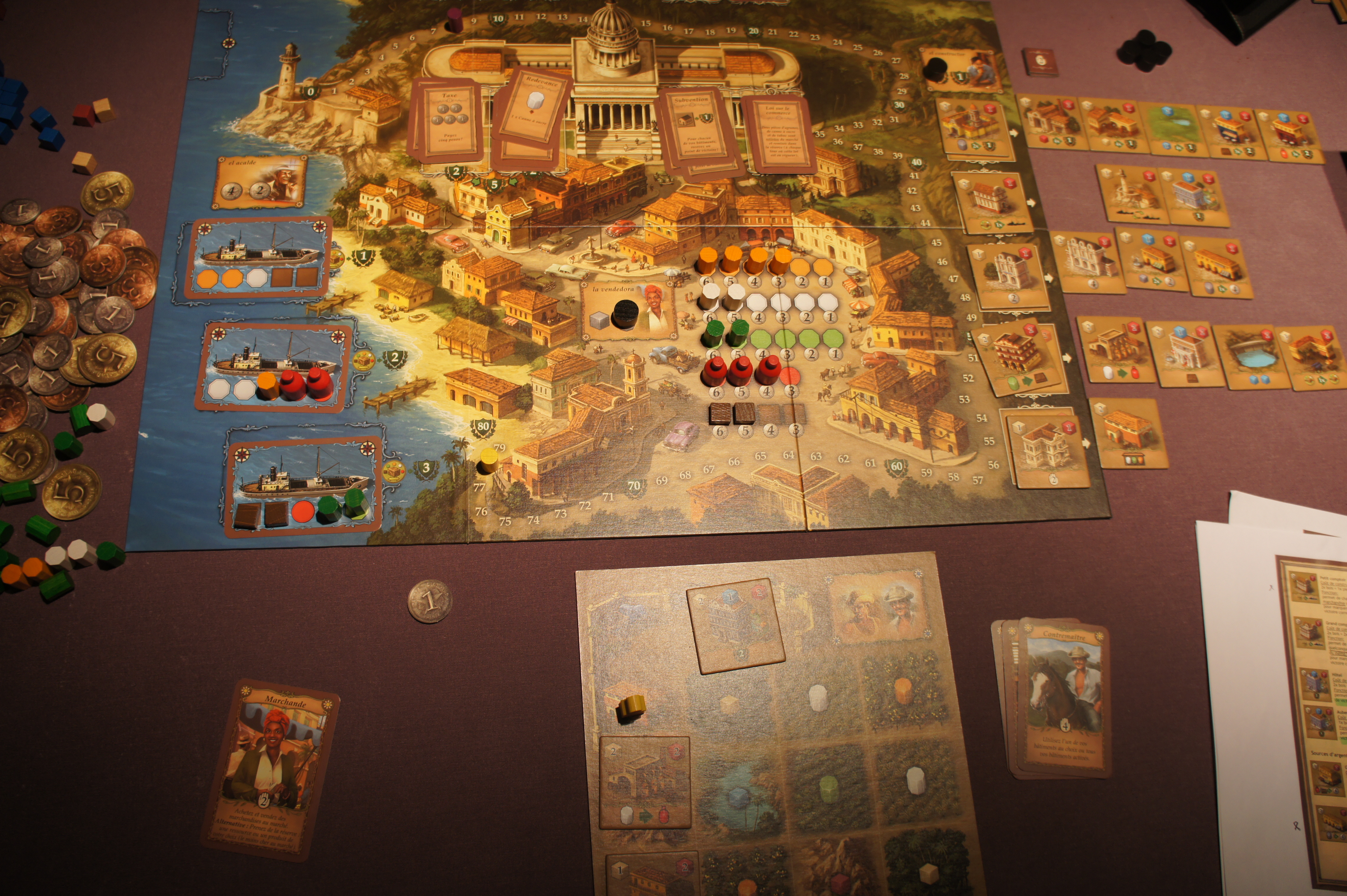 Le second élément que j’ai fort apprécié durant cette partie est, à l’image de l’excellent Caverna, le nombre et la variété des bâtiments. Cuba en propose une bonne vingtaine alors qu’on n’en construit en général que 3-4 en cours de partie. Ca permet une belle variabilité des parties et des stratégies tant chacun a des avantages différents. A voir néanmoins si une stratégie sans rhum et sans cigare est viable…