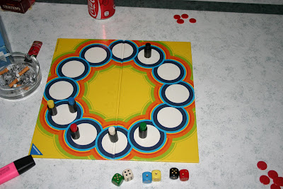 Ici, à son tour on lance les 6 dés de 6 couleurs différentes puis chacun a 30 » pour dire le nombre de points de victoire qu’il peut engranger. Celui qui a annoncé le plus grand nombre peut placer des cylindres de couleurs dans les anneaux noirs déjà placés sur le plateau.