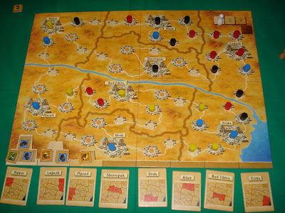 Ensuite le mécanisme d’ajout, retrait et déplacement de ses pions est génial car il influence l’importance de la province concernée: seulle les trois provinces les plus importantes gagneront des ressources! En outre, il faut choisir entre placer ses pions sur des villes qui ont plus d’importance ou sur les frontières qui permettent de se déplacer plus rapidement. Il est aussi possible de bloquer un adversaire en retirant un pion pour empêcher son passage.
