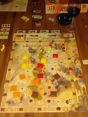 Bref, Assyria est un jeu très agréable et très tactique, à chaque tour, les choix sont cornéliens et on réfléchit une plombe afin d’optimaliser son coup. Malheureusement, il n’est pas très original et aucune vision stratégique n’est possible car on ne connaît pas les ressources à venir et nos huttes disparaissent à la fin des 3 ères par la montée du Nil.