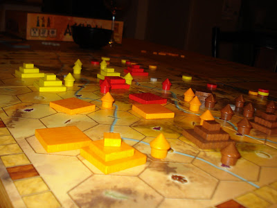 Ma 5ème partie de ce très bon jeu a confirmé une chose: j’adore y jouer à 2! Le jeu perd de sa dynamique à 4, surtout avec des joueurs découvrant le jeu. Excepté ce léger défaut, j’ai beaucoup aimé cette partie, surtout pour son aspect tactique de placement et de survie des hutes. L’idée de base est très originale et intéressante. Personellement, et ce n’est qu’une question de goût, j’aurai plus insité sur ces aspects dans le développement du jeu en évitant d’y greffer d’autres systèmes annexes afin de créer des stratégies de jeu, de facon peut-être trop artificielle. Vive les jeux tactiques!!!