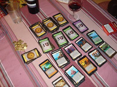 Ma femme et moi sommes de grands passionnés de Dominion au point d’en avoir fait quelques centaines de parties, avec les 3 boîtes… J’ai été très heureux donc de faire découvrir Seaside à Swatsh qui a eu l’air d’apprécier. Cette extension me plait de plus en plus car elle apporte des cartes qui peuvent être très puissantes si elles sont bien exploitées et si, parfois, la chance est avec vous. Car la grande force de ce jeu est que au lieu de tenter de diminuer le facteur chance, les développeurs l’admettent et jouent avec en introduisant des cartes de type « ca passe ou ca casse », créant de ce fait des tensions très agréables. Sur cette partie Swatsh a d’ailleurs raté plusieurs attaques avec son bâteau pirate, ratages qui lui ont été fortement préjudiciables pour la partie. L’art de bien jouer à Dominion est de tenter d’agir sur ce facteur chance en ajustant la construction de son deck. Acheter très peu d’or si l’adversaire part sur les bateaux pirate, par exemple.