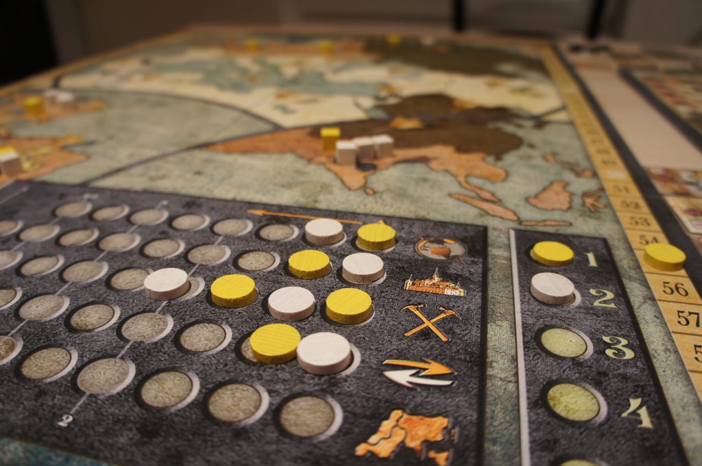 + Les régions sur la carte donnent un avantage au joueur majoritaire (des cubes population, des ressources, de la nourriture ou de l’argent), en plus des point victoires. Il faut combiner ces avantages avec les tuiles « terrains » (dernière action sur le tableau des actions) qui vous permettent aussi d’augmenter votre population, votre niveau de nourriture, etc.