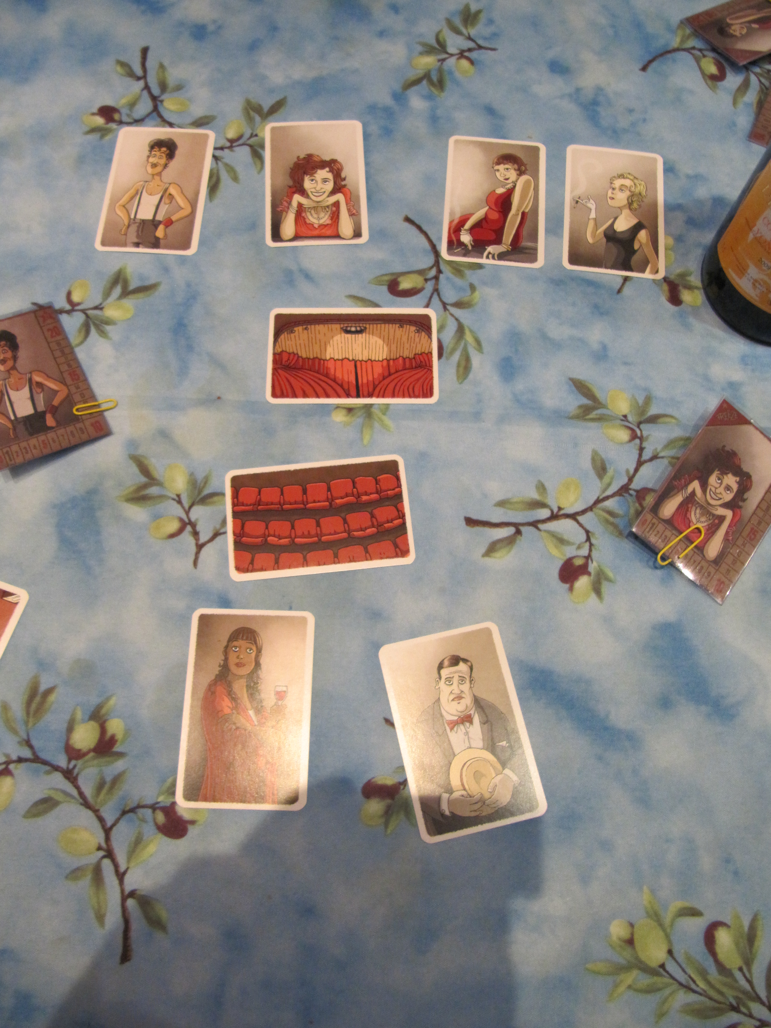 Grâce à un système astucieux de cartes (cfr photo du bas), on désigne 4 acteurs qui joueront la pièce et les autres seront spectateurs. On a alors 2 paquets de 4 cartes numérotées chacune 1-2-3-4. On prend une d’un paquet qu’on mélange à l’autre. On distribue alors 1 carte à chaque acteur et la dernière, on la montre à tout le monde. Si par exemple on voit un « 3 ». On sait que soit personne n’a de carte « 3 » ou au maximum 1 personne a un « 3 ».