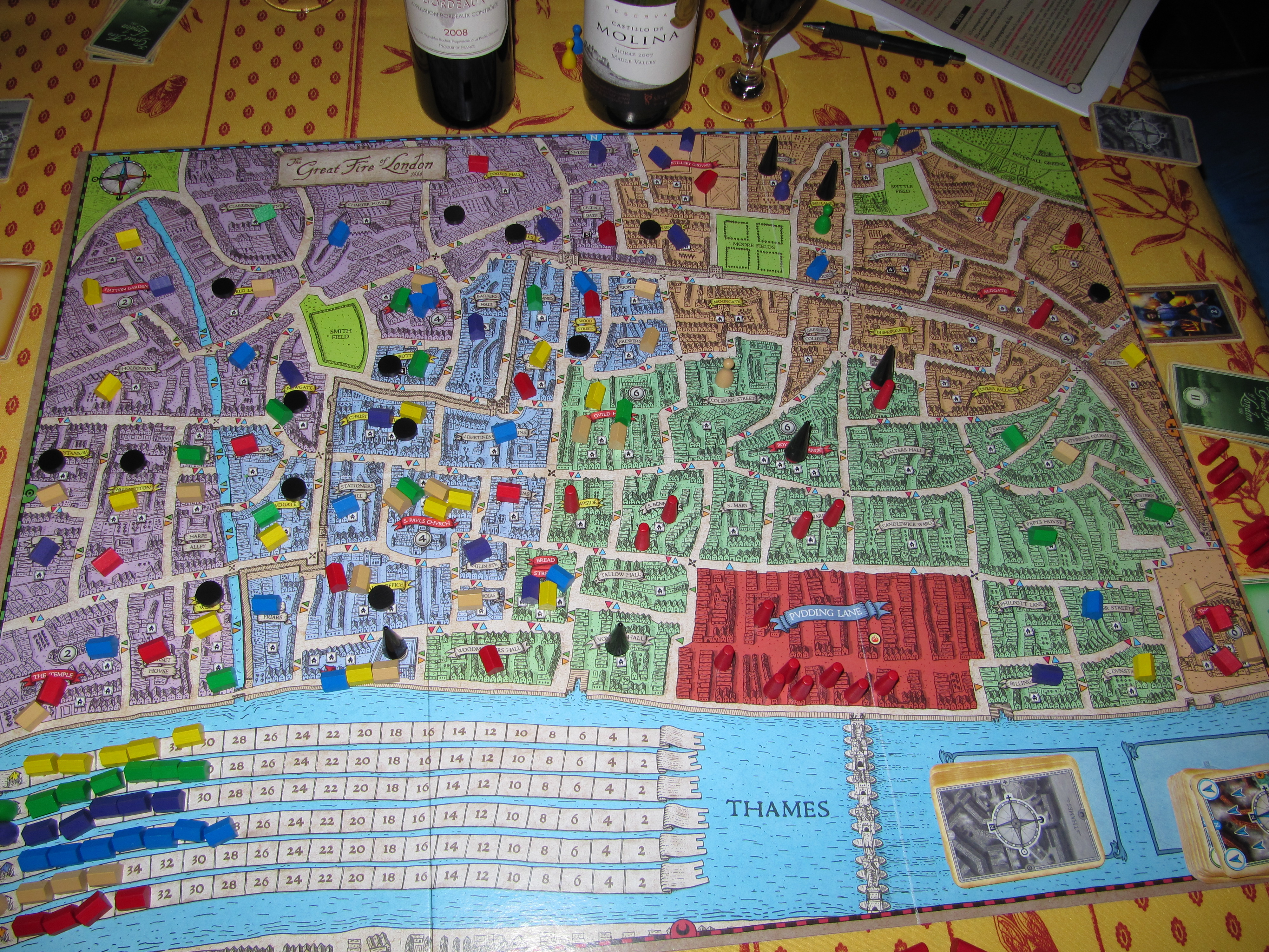 The Great Fire of London 1666 est tout d’abord un jeu au thème fort. Ce grand incendie de Londres (de 1666 si je me souviens bien) est magnifiquement représenté dans le jeu: L’incendie se développe, s’intensifie et toute la population s’acharne à essayer de le réduire et y parvient mais jamais suffisamment. Rien que pour ça je dis bravo!