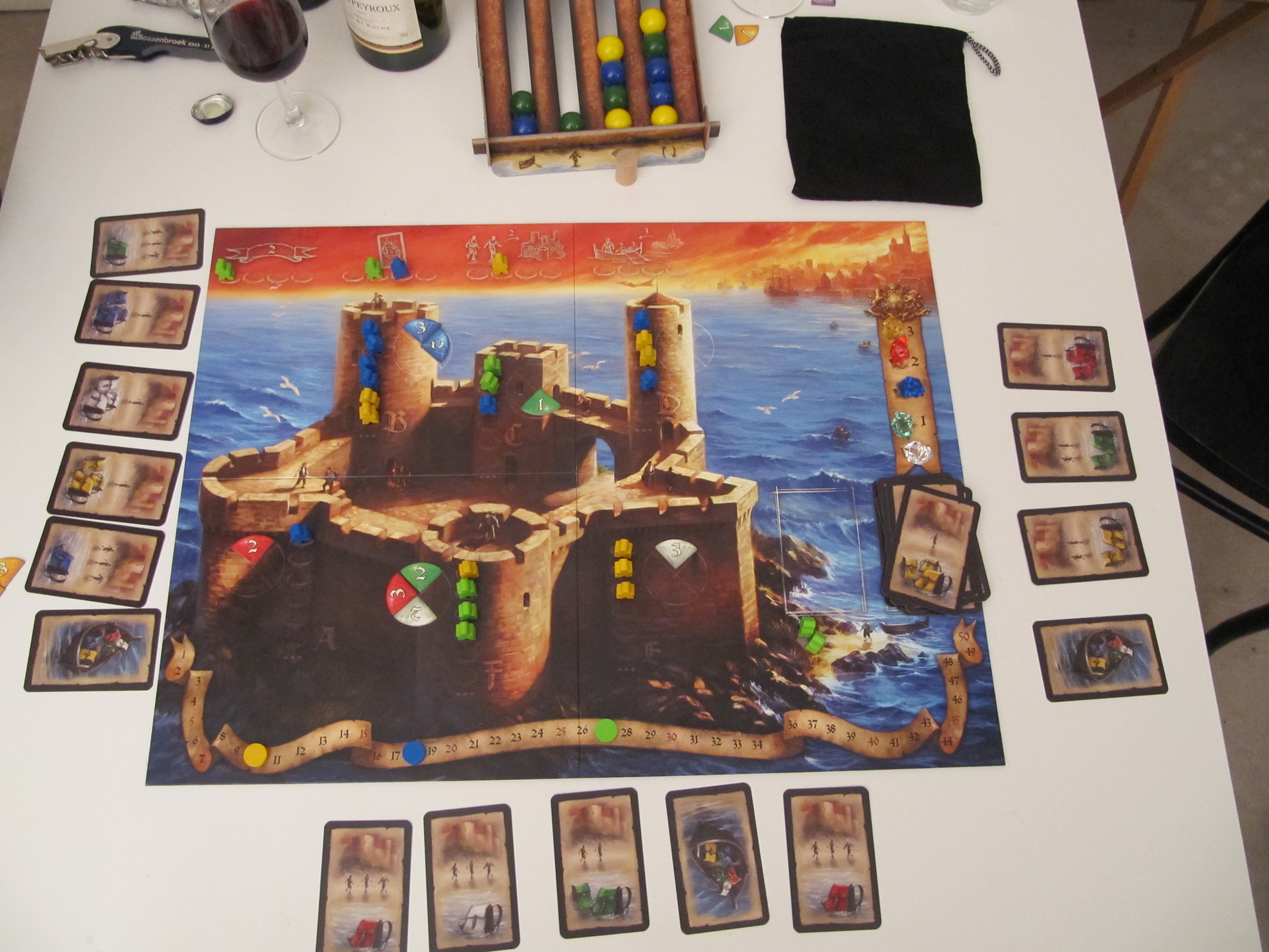 J’ai bien apprécié Le Secret de Monte Cristo. Les action par « sliding » est vraiment original. Le boulier compteur indique les actions disponibles. Il y en 4. Et chacune sera exécutée dans l’ordre. Mais seulement le joueur qui possède la boule tout en bas pourra faire l’action. Et ensuite, il doit déplacer sa boule et la placer en haut d’une autre colonne (càd d’une autre action). C’est le mécanisme le plus intéressant du jeux car il exige une espèce de planification dans le temps: il faudra attendre que la boule de sa couleur « touche le fond » pour pouvoir effectuer cette action! Vraiment très original.