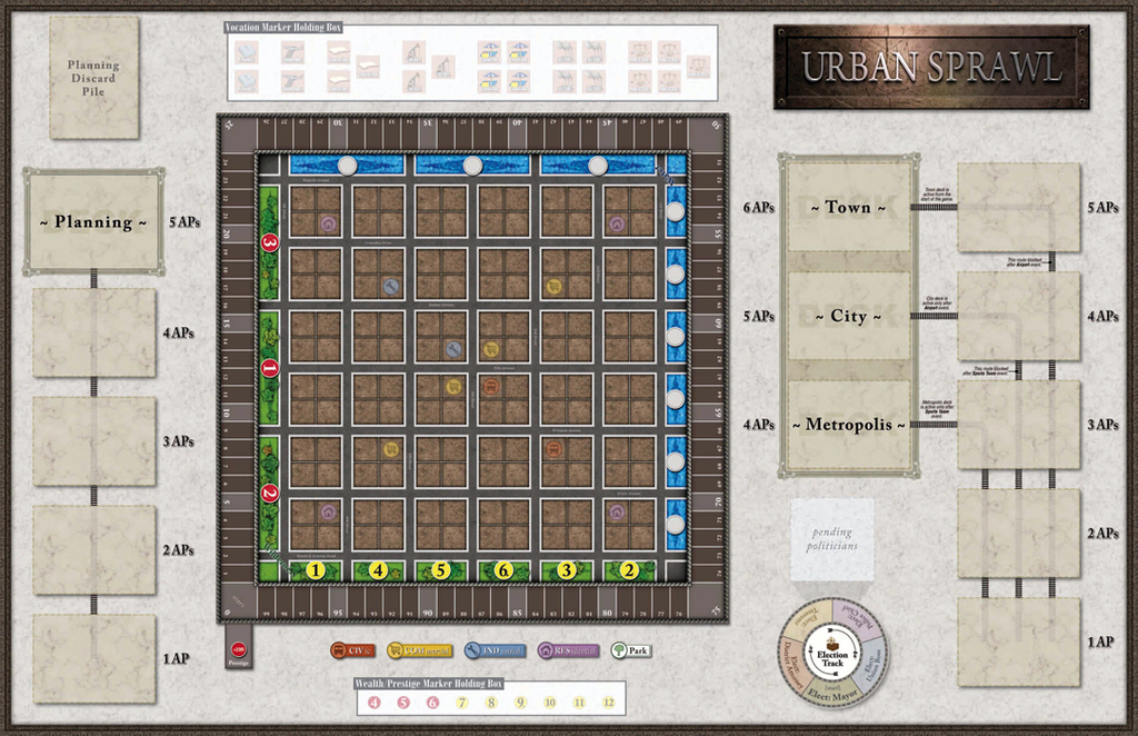 Dans Urban Sprawl, les joueurs vont construire une ville et le thème est magnifiquement rendu. Contrairement à Dominant Species, dans Urban Sprawl les choix ne sont pas légions. A son tour, on reçoit 6 points d’actions (PA) que l’on pourra dépenser de 2 façons différentes:
