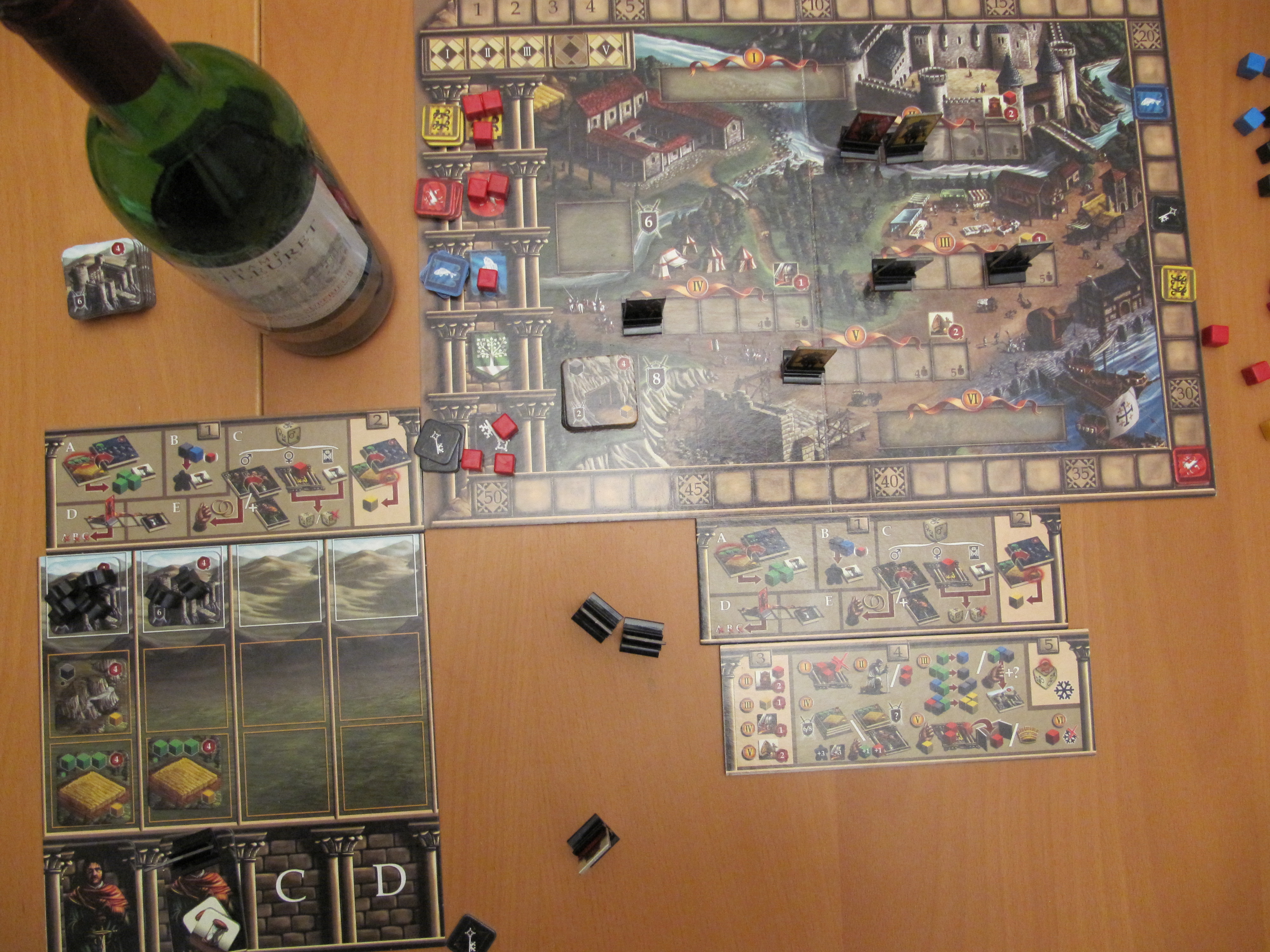 Ces 3 actions sont à chaque fois accompagnées de la prise d’un jeton temps sur le plateau qui en comporte, en début de phase, 16 à 4 joueurs. On aura donc droit à environ 4 actions lors de cette phase. Quand un chevalier reçoit son 4ème jeton temps, il meurt et s’il a un héritier, pas de souci, celui-ci prend la relève, dans le cas contraire, c’est la cata! J’espérais beaucoup de ce mécanisme mais au final, j’ai été assez déçu du résultat. Les actions sont assez évidentes, on s’est surpris à réaliser chacun toutes les mêmes actions au premier tour. De plus, cette phase est très répétitive et sans aucun fun.