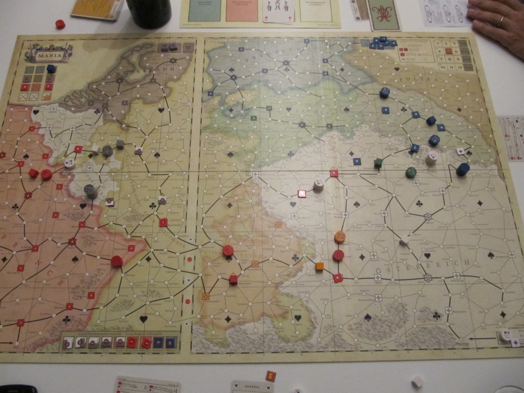 – Les 4 grandes puissances (Autriche-Prusse-France-Armées Pragmatiques) ainsi que les 2 puissances secondaires sont contrôlées par les 3 joueurs dont un contrôle 2 puissances ennemies. C’est super original et ça tourne bien. De plus, toutes les puissances ont un seul ennemi: l’Autriche dirigée par … Maria-Thérésa aidée par les armées pragmatiques. Le joueur Autrichien aura donc les 2 autres joueurs sur le dos. C’est très marrant pour les autres joueurs mais le rôle de l’Autriche est fort défensif. Ce qui fait qu’il va n’avoir aucune prétention à la victoire mais plus un rôle d’empêcher la victoire de ses adversaires voire même d’avoir une position de kingmaker. Pas très très fun comme rôle.