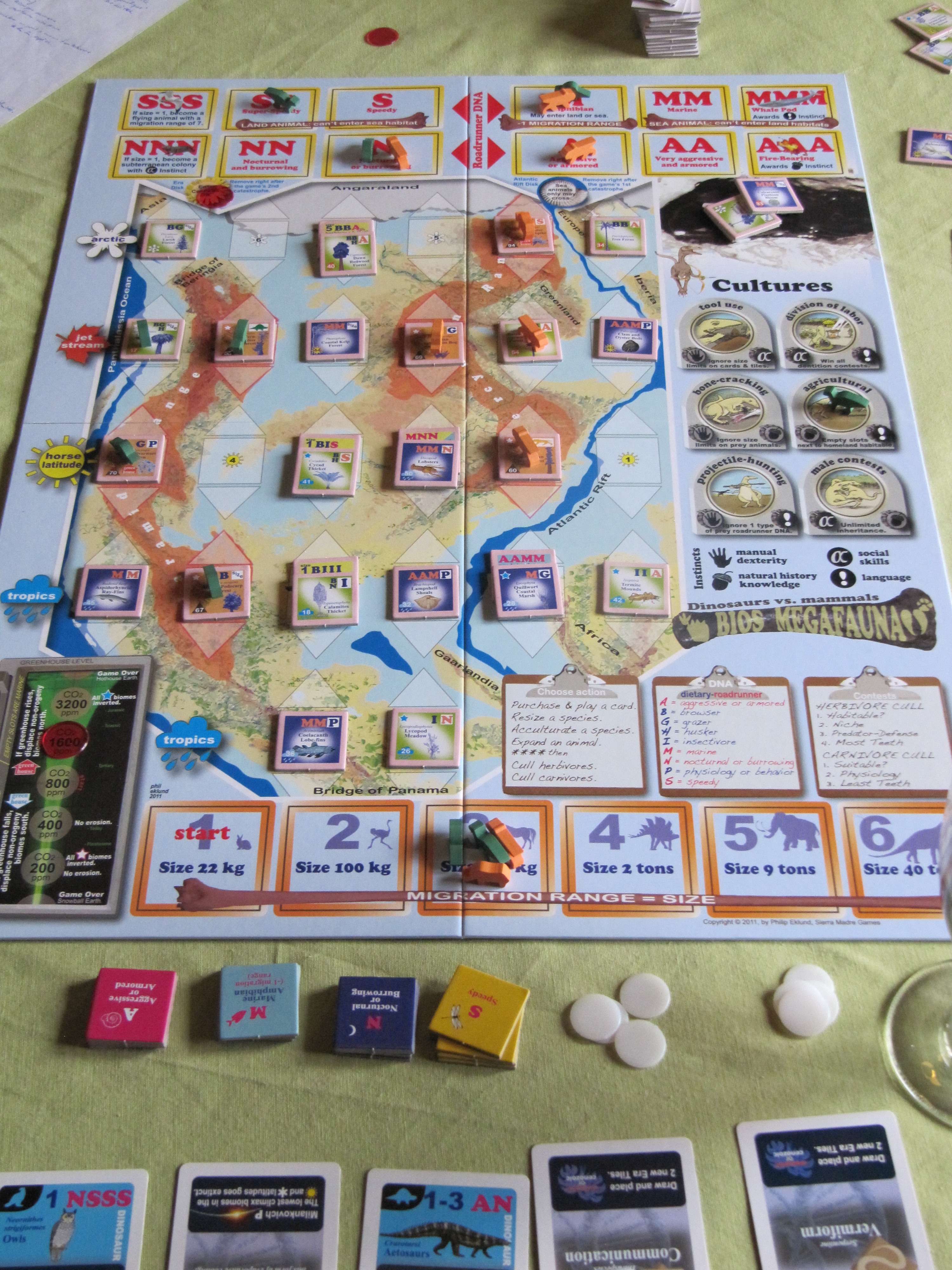 BIOS Megafauna, un jeu qui est resté sur mon étagère plus d’un an. Un jeu que SwatSh m’a passé en me disant: « Si t’es partant pour lire les règles, je te laisse la boîte. J’ai essayé et il y a des renvois de pages partout. J’abandonne ». Et bien, j’ai plusieurs fois sorti la boîte et lu les règles, jusqu’à entamer une aide de jeu/aide mémoire. Le hic, c’est que j’abandonnais moi-aussi, sans abdiquer pour autant. Petit à petit, le tour de jeux s’est dessiné, malgré toutes les exceptions, règles particulières, etc. Au retour d’Essen, je me suis dit que c’était maintenant ou jamais. Je l’ai donc ressorti, me suis replongé dans les règles, repris mon aide non terminée et pris quelques notes supplémentaires. Au final, je n’étais pas encore 100% à l’aise mais je ne pense pas que je pouvais l’être plus.