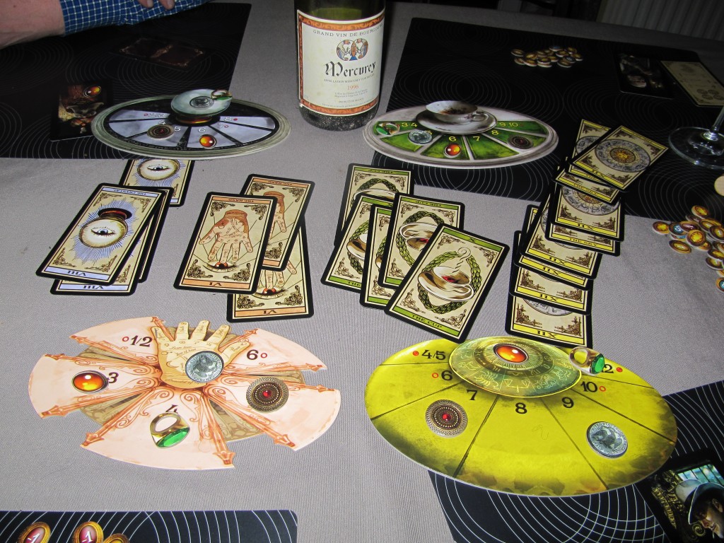 Divinare est donc assez simple mais est très subtil à différents niveaux. D’abord les prévisions de chaque joueur peuvent vous donner une indication du nombre de cartes qu’ils connaissent. Un peu de bluff ici peut faire mal… Ensuite, le choix des cartes à passer à son voisin est crutial car non seulement il les connaitra, mais aussi il pourra les jouer et vous ne pourrez pas les jouer. Ce qui peut vous arranger car si vous jouez une carte, vous devez déplacer votre jeton de prédiction. Si votre prédiction actuelle est mauvaise ça peut vous arranger mais si vous estimez qu’elle est bonne, ça peut faire grincer des dents. Et bien sûr, idem pour votre voisin qui devra jouer au moins une carte que vous lui aurez donnée.