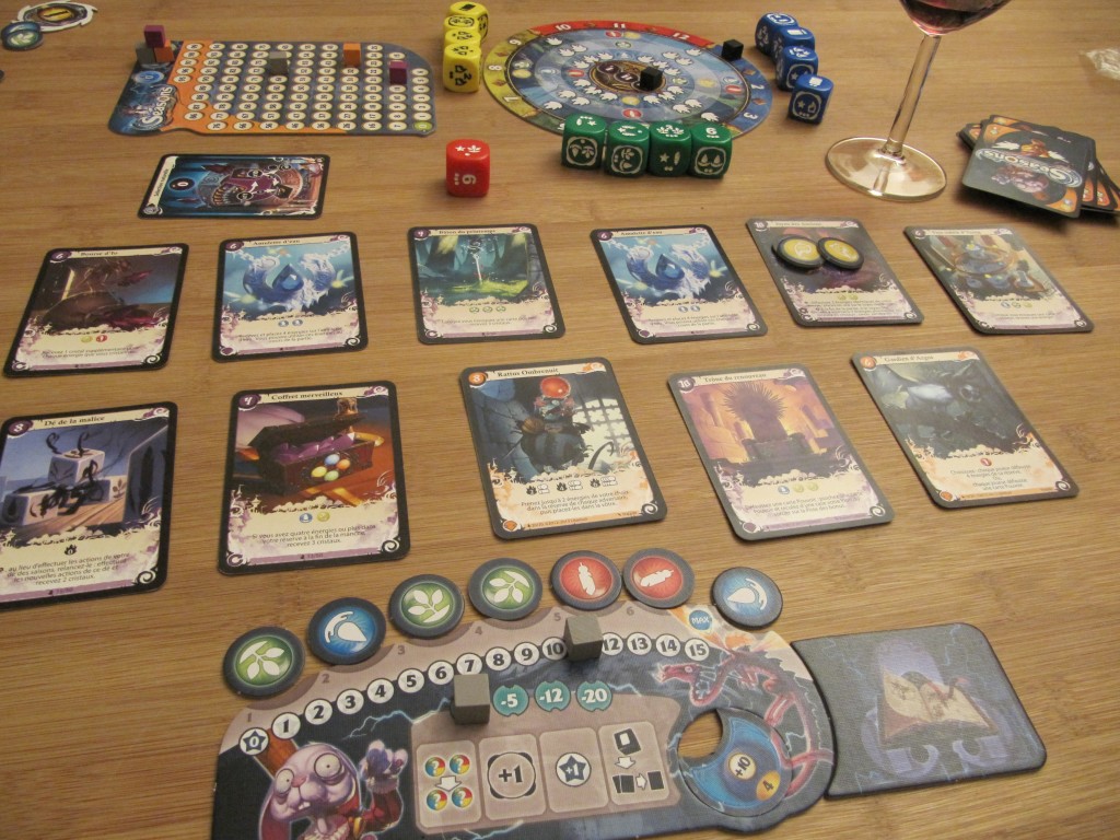 Les joueurs reçoivent aussi 3 jetons en début de partie dont ils n’en garderont qu’un. Ce jeton leur apportera des points de victoires supplémentaires ou des pouvoirs supplémentaires si certaines conditions sont rencontrées (ex: à la fin du jeu, chaque carte encore en main rapporte 3 points, si on perd un point d’invocation, on gagne 10 points, défausser 4 eaux et gagner 20 points,…). Sympa, ça donne aux joueurs un objectif supplémentaire.