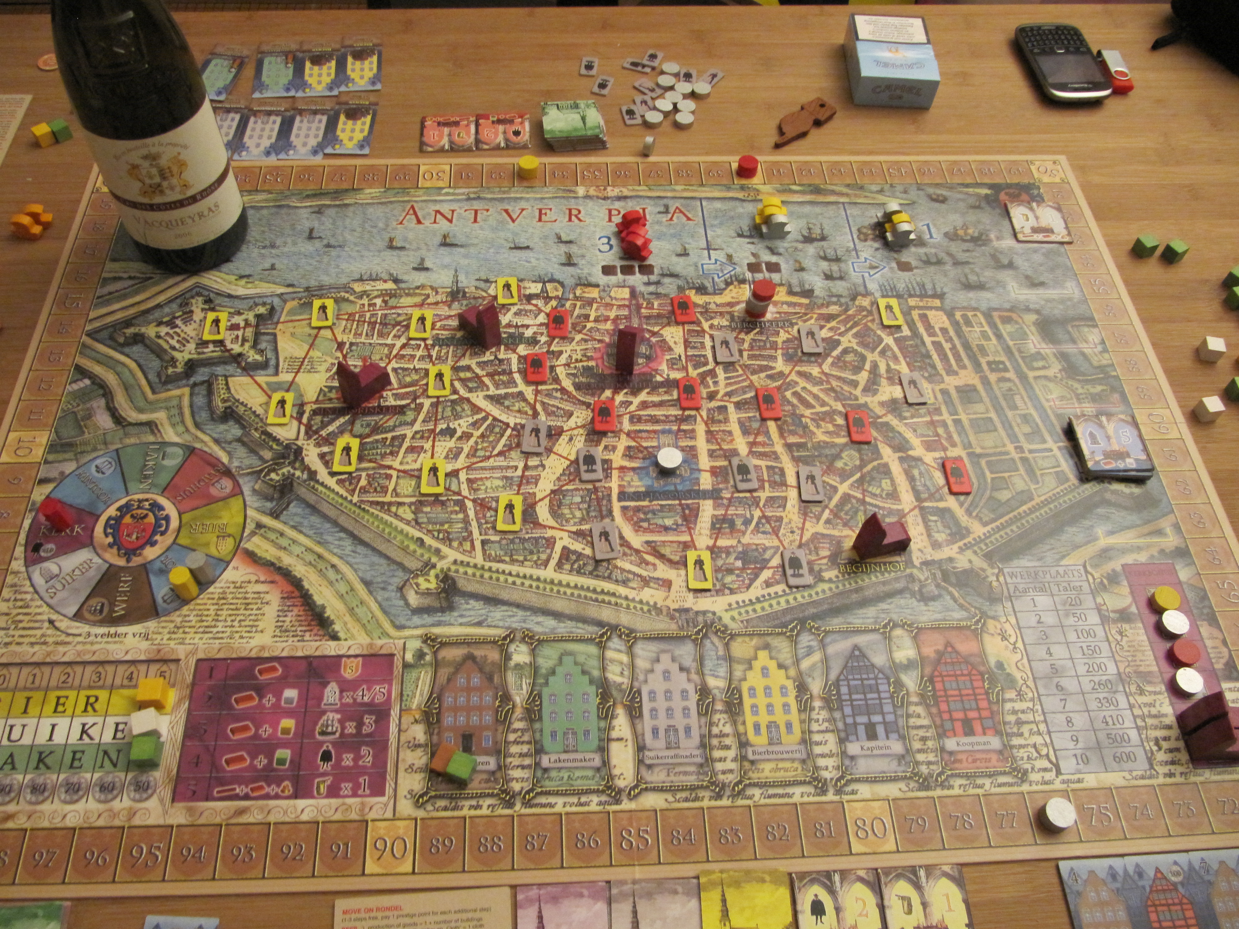 La première chose qui frappe dans Antverpia est la laideur de son plateau.  Bon, ce n’était pas la grande force d’Hamburgum non plus, mais là, on touche les sommets!  A tel point qu’il ne me donne vraiment pas envie d’y jouer.  Heureusement qu’il a été créé par un auteur de génie et qu’Hamburgum est un petit chef d’œuvre sinon je n’y aurais jamais joué.
