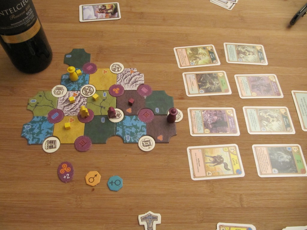La mécanique d’Asgard’s Chosen est vraiment très particulière et originale.  Ce que j’adore, c’est son côté « chaîne sans fin » qui marche bien: On va jouer des cartes pour conquérir de nouveaux territoires (neutres ou appartenant à un autre joueur), contrôler ces territoires et jouer d’autres cartes nous permettront de pouvoir acquérir de nouvelles cartes qui nous aideront à conquérir des territoires et donc à acquérir d’autres cartes,…