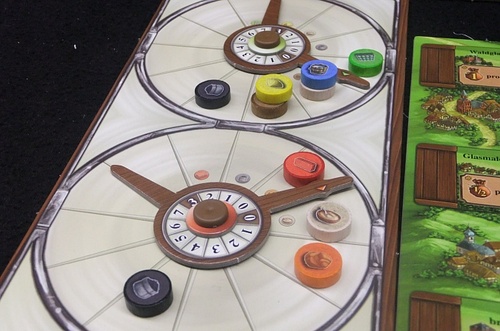 La gestion des ressources est très particulière et comme seul Uwe peut le faire.  Uwe affectionne particulièrement  les systèmes originaux de gestion de ressources.  Son système dans Le Havre Port Fluvial m’avait déjà scotché.  Dans La Route du Verre, il utilise le système de la roue des ressources comme il l’avait déjà expérimenté dans Ora et Labora.   Mais ici, il va encore plus loin en ajoutant une deuxième aiguille (si si ;-)) et en plaçant une ressource de l’autre côté de l’aiguille.  Dès qu’il y a un espace de vide à droite des 2 aiguilles, elles tournent.  Ce qui fait que la majorité des ressources diminuent tandis que la ressource située derrière l’aiguille, elle, augmente.