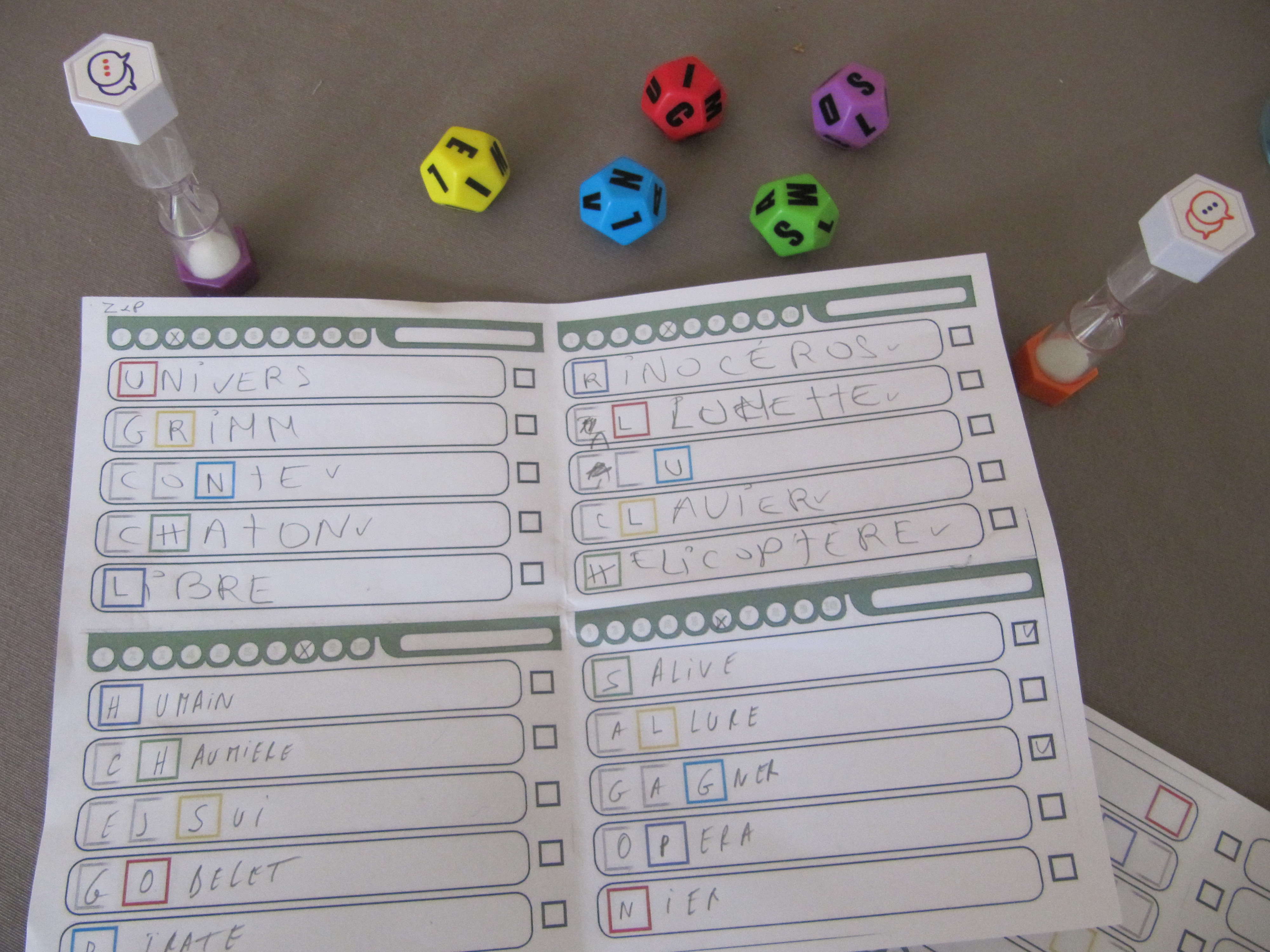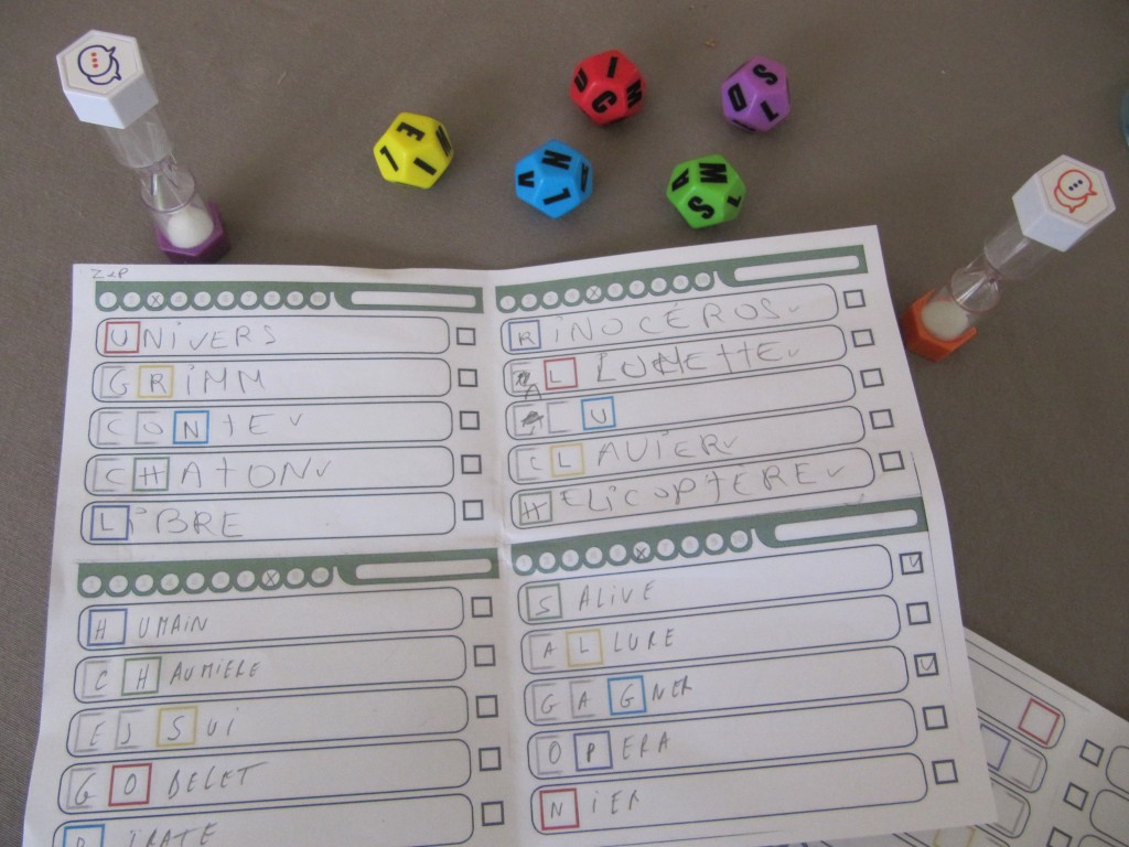 Au début d’une manche, on jette les 5 dés 12 faces qui vont montrer une lettre. Un joueur par équipe va les écrire dans la case de couleur correspondante de son feuillet. Ces lettres se trouveront alors en 1ère, seconde ou 3ème position d’un mot à trouver. Ensuite, on retourne les sablier et chaque équipe va écrire les 5 mots de sa feuille en suivant la contrainte de la lettre imposée. Dès qu’une équipe a terminé d’écrire ses 5 mots, elle arrête son sablier (elle le couche). Ce sablier couché a donc retenu le temps nécessaire à cette équipe pour écrire ces 5 mots. L’autre équipe aura exactement ce même temps pour deviner les mots écrits.