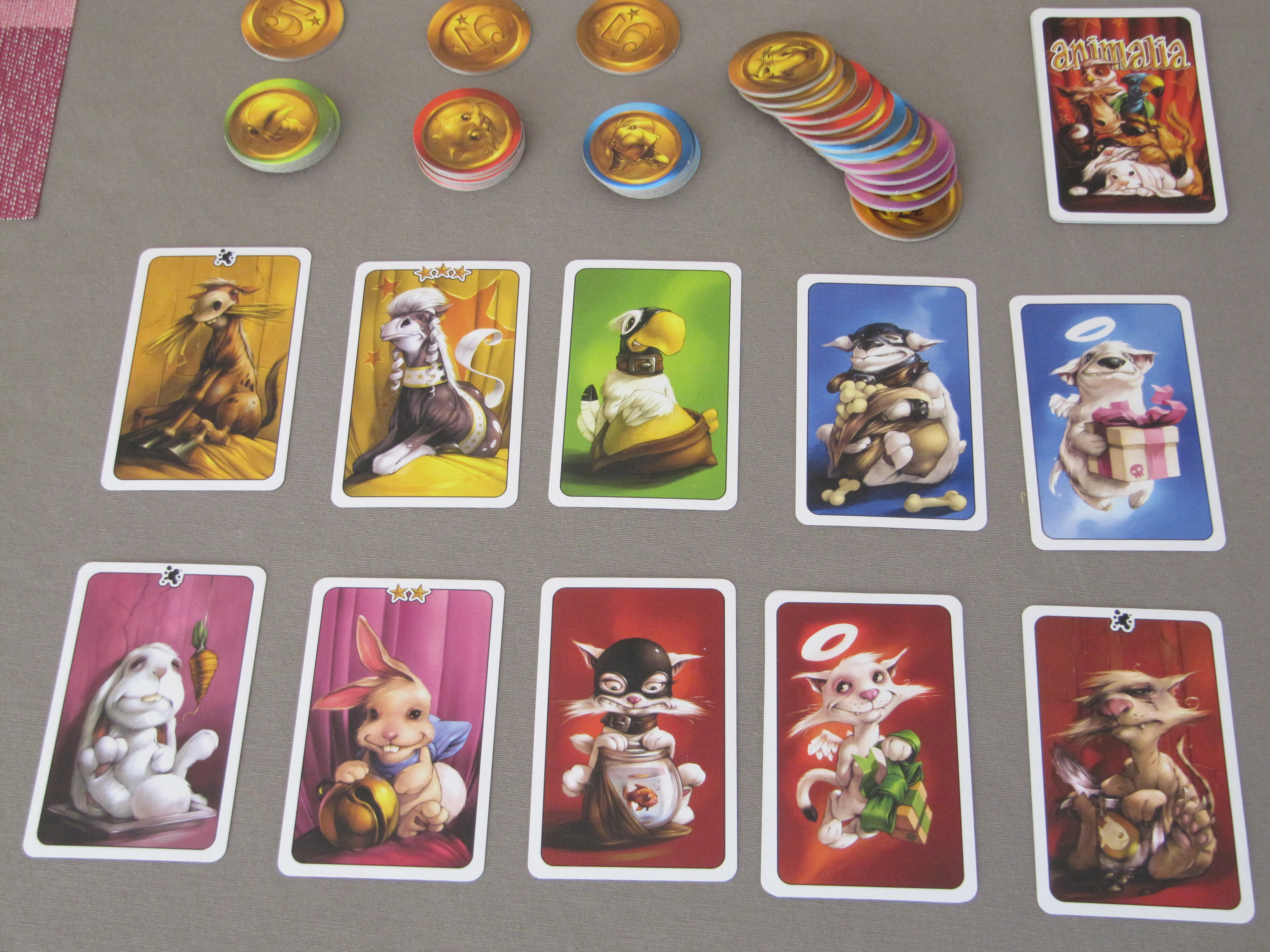 Dans Animalia, il y a 5 couleurs de cartes, chacune représentant un animal: chien, chat, cheval, perroquet et lapin. Le jeu se joue en 3 manches et à la fin de chaque manche, on possède une équipe de 5 cartes. On reçoit une médaille pour chaque animal qu’on possède à condition d’en posséder au moins 2 exemplaires. Autrement dit, chaque animal unique ne vous rapporte rien.