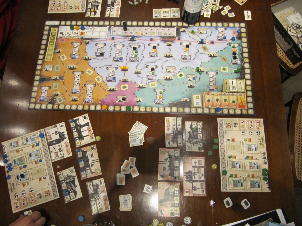 Avec Kohle & Kolonie, vous voilà plongé dans le monde du charbonnage et des mines. L’action se déroule en Allemagne au début de l’ère industrielle et vous allez devoir acquérir des mines, puis les moderniser et enfin les fusionner. Vous disposez également de travailleurs qui vont assurer toute une série de tâches autour de vos mines et serez aussi amenés à développer le système ferroviaire reliant vos mines. Le jeu se déroule en un nombre élevé de phases et les actions possibles sont multiples. Tout cela donne un très bon jeu mais assez complexe (règles lourdes) et qui n’est pas simple à appréhender dans sa globalité dès sa première partie (en tout cas pour moi 😉 ) . Très beau potentiel donc pour ce jeu que je qualifierais « d’expert ».
