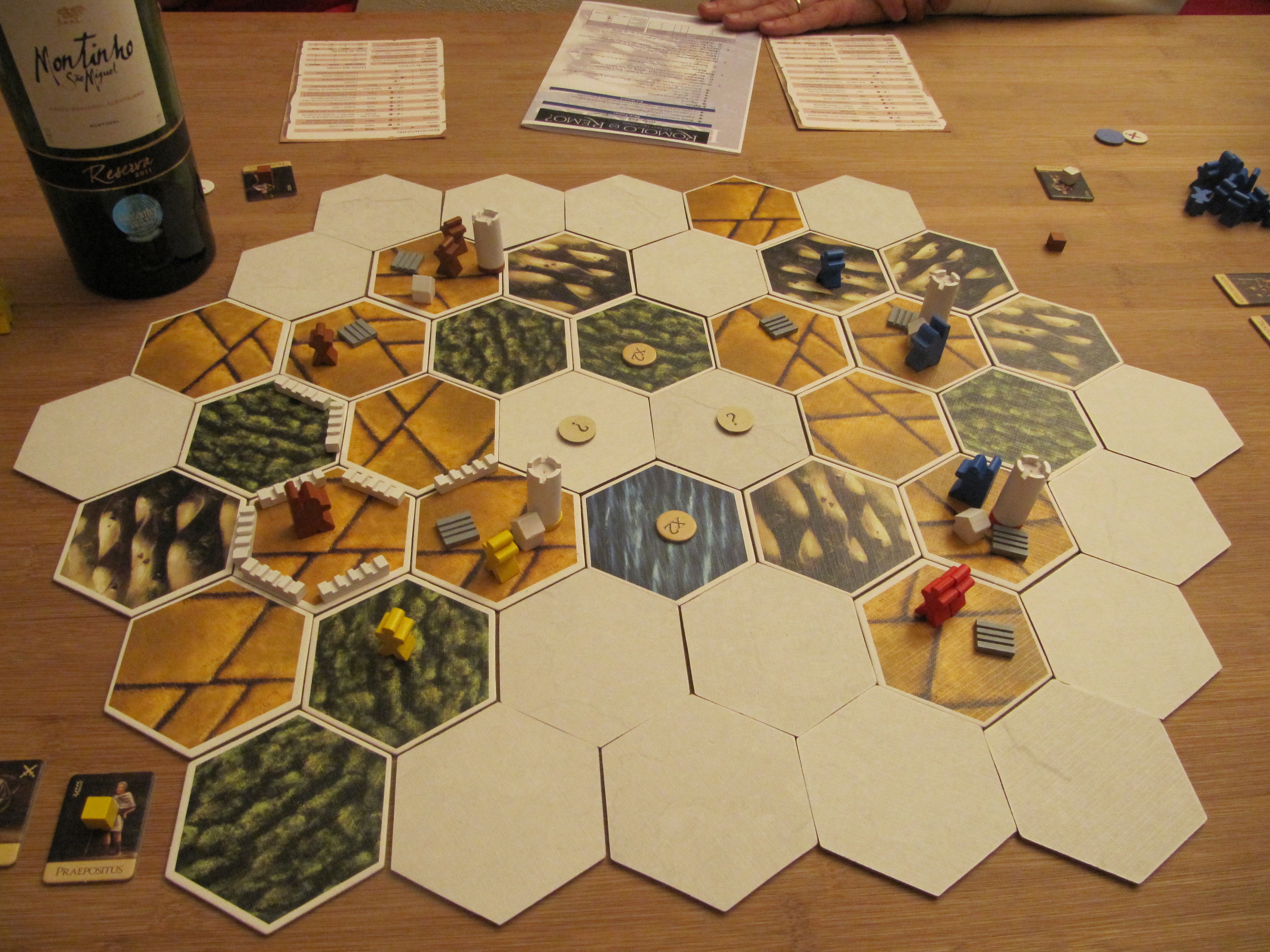 Ces 2 éléments ont rendu notre partie désastreuse car après près de 4 heures de jeu nous étions nulle part: très peu, voire aucun bâtiment construit, très peu de tuiles découvertes et très peu de développement. J’ai néanmoins le sentiment que c’était une partie bâclée et qu’on n’a trop peu utilisé le pouvoir des murs protecteurs qui auraient pu, je pense, contrer ces 2 stratégies (le Praedo qui vole et l’armement à outrance).