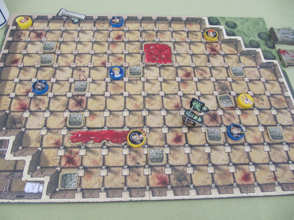 En effet, le jeu se déroule en 2 phases.  Lors de la première, on déplace ses 3 ou 4 personnages (en fonction du nombre de joueurs) d’un maximum de cases égal à leur capacité de déplacement.  Puis, on révèle la prochaine carte tombe (seul élément hasardeux du jeu) qui va indiquer de combien de cases la créature va se déplacer.  Et c’est là tout le génie de Friedemann puisque la créature va aller tout droit jusque quand elle voit un personnage, elle va alors se diriger vers se dernier et si elle en voit plusieurs, elle va se diriger vers le plus proche.  On va donc essayer de placer ses persos pour attirer la créature vers nous qui de par ce fait va voir d’autres persos adverses plus proches d’elle pour les bouffer à notre place.  Enfin, ça se passe si on calcule bien, si on repère bien ses mouvements à l’avance et si ses adversaires n’arrivent pas à nous surprendre et à attirer la créature vers un endroit qu’on aurait pas prévu….  Très très bon.