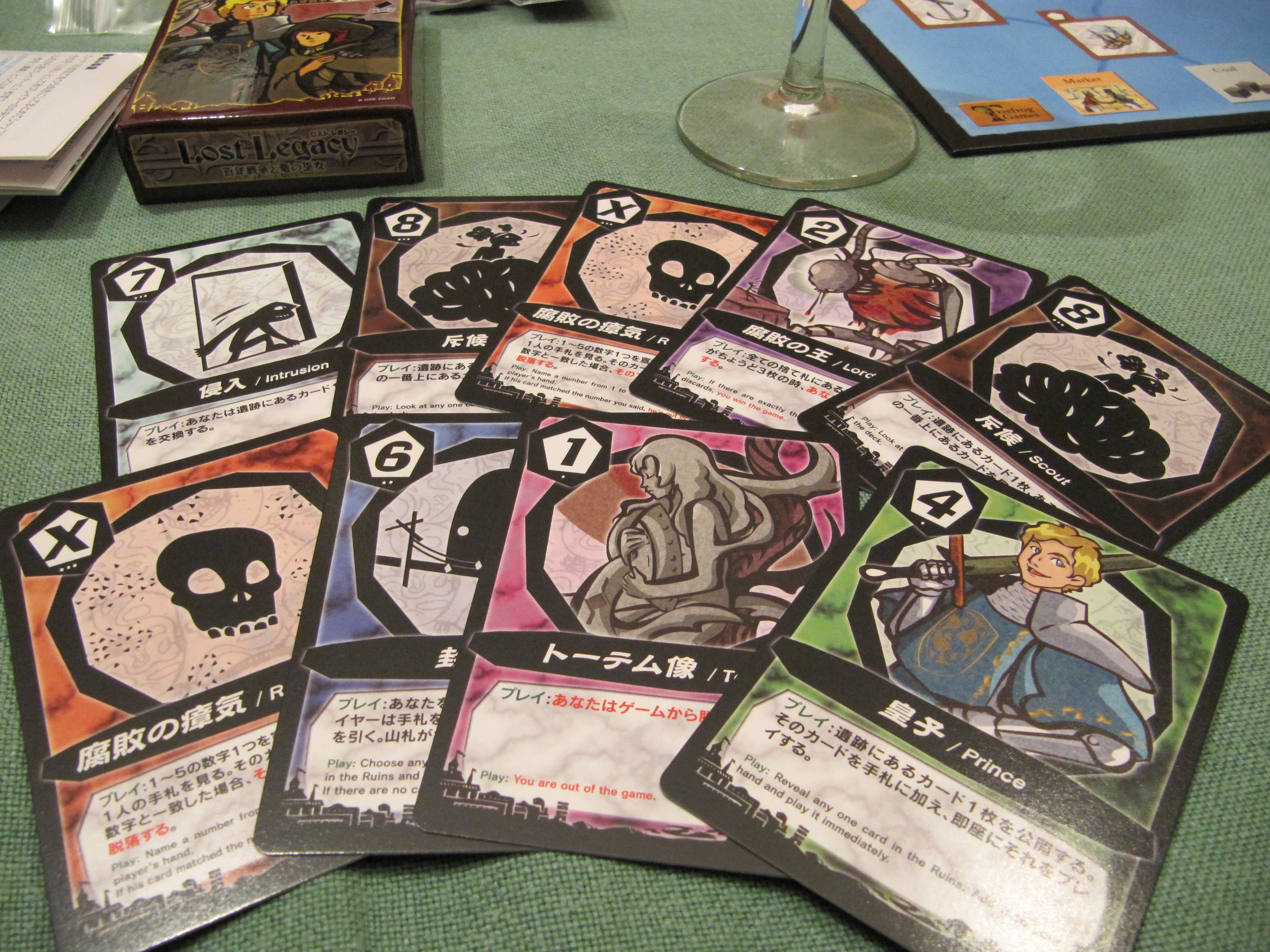 L’originalité de Lost Legacy qui en fait toute sa saveur et son côté indispensable pour tout amateur de Love Letter est sa fin enquêtrice.  En effet, à la fin, quand il ne reste plus de carte dans la pioche, les joueurs vont, chacun à leur tour en commençant par le joueur ayant la carte de plus faible valeur, annoncer qui ils pensent qui a la carte Lost Legacy (elle peut soit se trouver dans la main d’un des joueurs soit dans une pile de carte(s) spécifique sur la table appelée Ruines).  S’il le joueur a trouvé, il l’emporte immédiatement, sinon, on passe au joueur suivant.  Inutile de vous dire qu’il vaut mieux rester avec une carte de faible valeur à la fin du jeu tant les possibilités de se douter fortement de qui a la carte Lost Legacy sont nombreuses.  En effet, les pouvoirs des cartes permettent de regarder d’autres, d’échanger,… mais aussi, et tout comme dans Love Letter, d’éliminer un joueur voire même de l’emporter avant la fin.