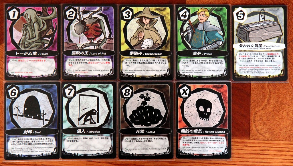 Lost Legacy: Hyakunen Senso to Ryu no Miko (vive le copié/collé 😉 ) est un jeu de Seiji Kanai, mais oui vous savez, l’auteur de l’étonnant et non moins plaisant Love Letter.  Et on reconnaît facilement sa patte: jeu minimaliste de 16 cartes.  Tous les joueurs ont une carte en main et en piochent une au début de leur tour puis en jouent une, appliquent son effet et passent la main au joueur suivant.  Et voilà toutes les règles 🙂 , très proche de Love Letter somme toute.