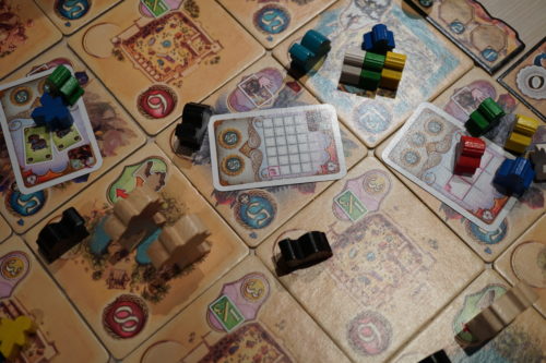 Tout comme dans le magnifique Trajan, Five Tribes reprend la mécanique de l’Awalé mais différemment. Ici, les joueurs vont prendre tous les meelples situés sur une des tuiles (placées aléatoirement sur un rectangle de 6×5 formant un plateau entièrement modulable donc) et en déposer 1 sur chaque tuile de son parcours jusqu’à arriver à la tuile de destination en y déposant son dernier meeple. Le déplacement se fait selon 3 contraintes: il doit être orthogonal, il ne peut pas y avoir d’aller-retour et la couleur du dernier meeple doit être de la même couleur d’au moins un des meeples situés sur la tuile d’arrivée.