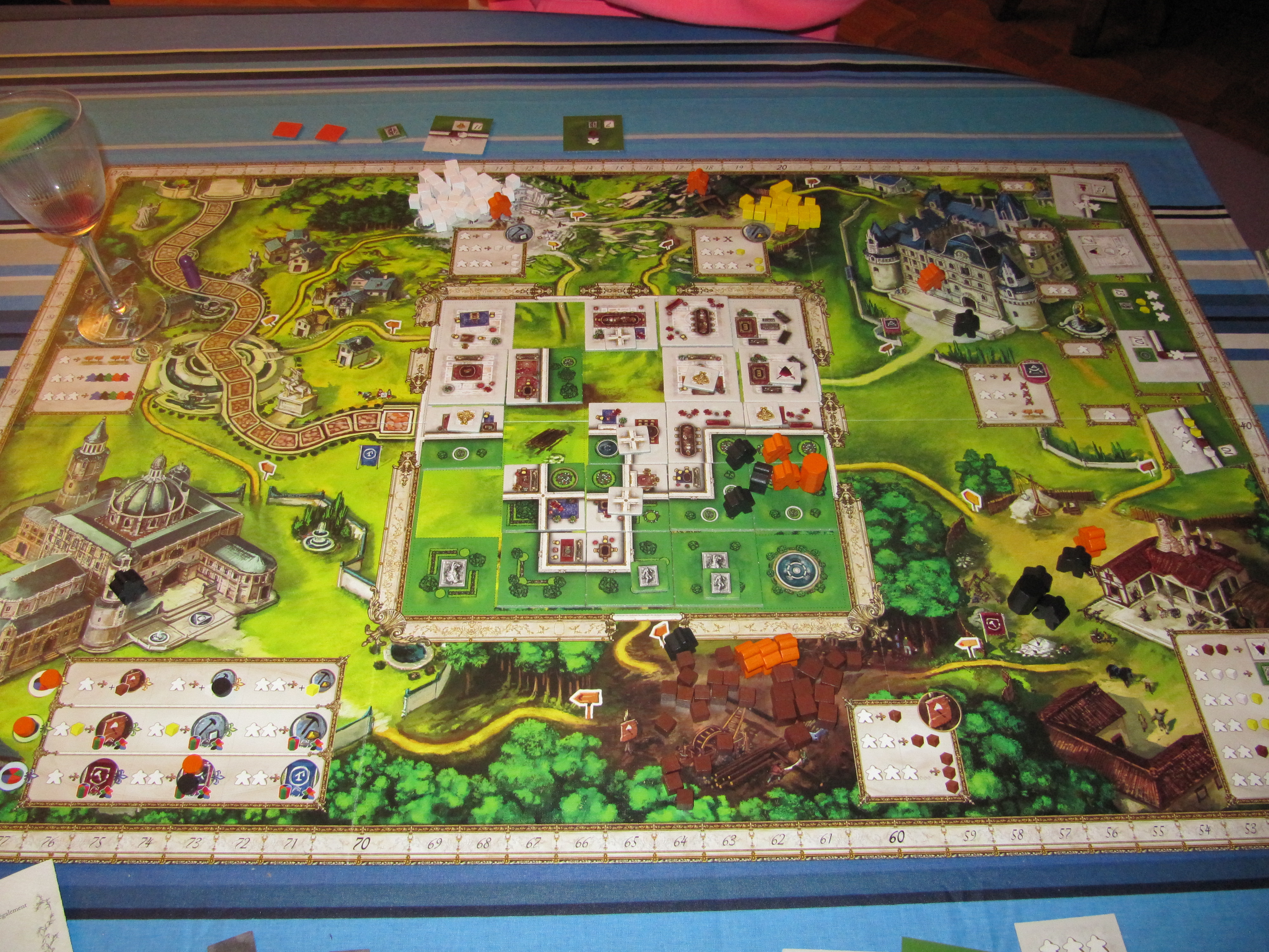 Versailles est son jeu le plus simple d’accès où le but est de construire le château de … Versailles ! 🙂 Il repose sur une mécanique de déplacement d’ouvriers sur une carte assez originale et inspirée par des jeux tels que Wunderland, Takamatsu ou Finca. A son tour, on déplace 1 de ses meeples d’un endroit du jardin de Versailles à un autre adjacent en suivant une route et son sens. En effet, les différents endroits du plateau sont reliés par des routes mais chaque route est en sens unique. On ne peut donc jamais faire d’aller-retour et si on veut que le même meeple revienne à l’endroit d’où il venait, il doit quasi faire tout le tour du plateau (certains raccourcis sont possibles). Cette mécanique de flèche limite bien entendu les possibilités et on se sent légèrement « forcé » par le jeu ce qui donne une certaine répétitivité dans les actions. Donc : on prend un meeple qu’on déplace le long d’une route en suivant la flèche pour arriver à un endroit où on va exécuter l’action de cet endroit. Du déjà vu certes mais l’originalité de cette mécanique est que la puissance de l’action dépendra du nombre de meeples à votre couleur dans la case de destination. Pour l’action récolte de bois par exemple, si il n’y a qu’un seul meeple dans la case d’arrivée, on prend 1 cube de bois, 2 meeples = 2 cubes, … C’est assez sympa bien qu’on va vite comprendre comment gérer tout ça : l’idéal est d’organiser des « glissements » en posant 1 meeple à un endroit puis en faisant venir ses petits copains un à un au même endroit puis en les déplaçant vers un autre endroit de la même façon. Si vous voulez aller plus vite, rien ne vous empêche de faire tourner un seul meeple le long du plateau et de garder les autres meeples fixes au même endroit.