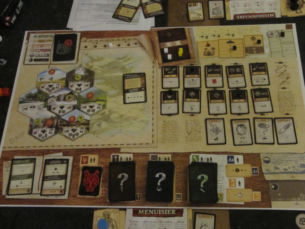 C’est clairement un des aspects du jeu qui fera dire « Waouw c’est vraiment trop génial » aux uns et « *utain c’est quoi encore le token jaune avec des lignes bleues à pois vert dont j’ai besoin pour construire le couteau dans la phase 3 juste après qu’on ait déplacé le camp grâce à la liane construite en phase 1 grâce au bois bonus récolé au départ… merde je comprends rien relis-moi un peu les règles ». Donc il faut vérifier si vous êtes du genre à plutôt vous retrouver dans le 2ème groupe, auquel cas il serait bon que vous passiez votre chemin…