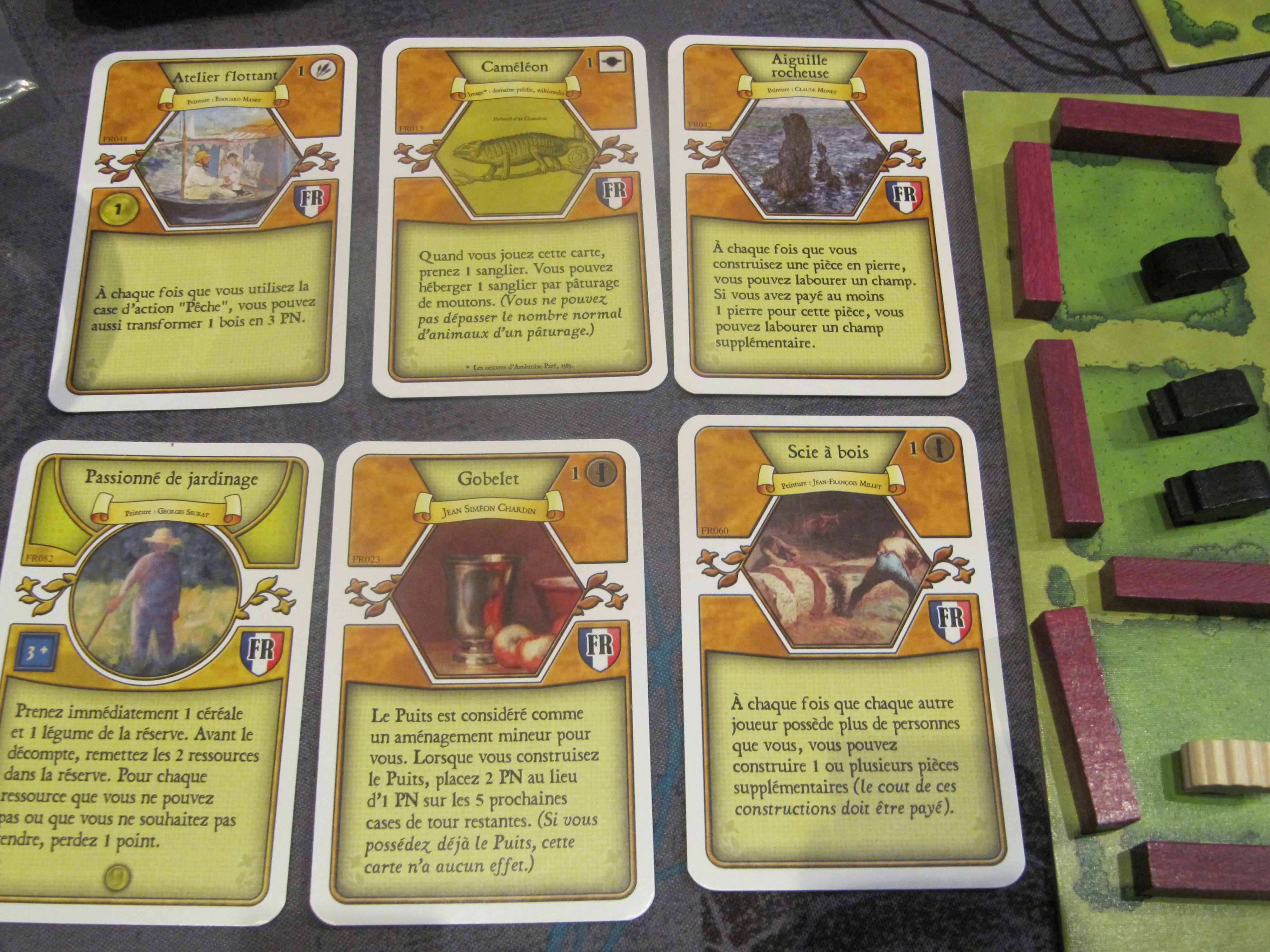 Agricola France comporte 2 decks: 1 deck de 60 cartes Savoir-Faire et 1 deck de 60 cartes Aménagements Mineurs. On peut les ajouter aux cartes du jeu de base ou jouer seulement avec elles.