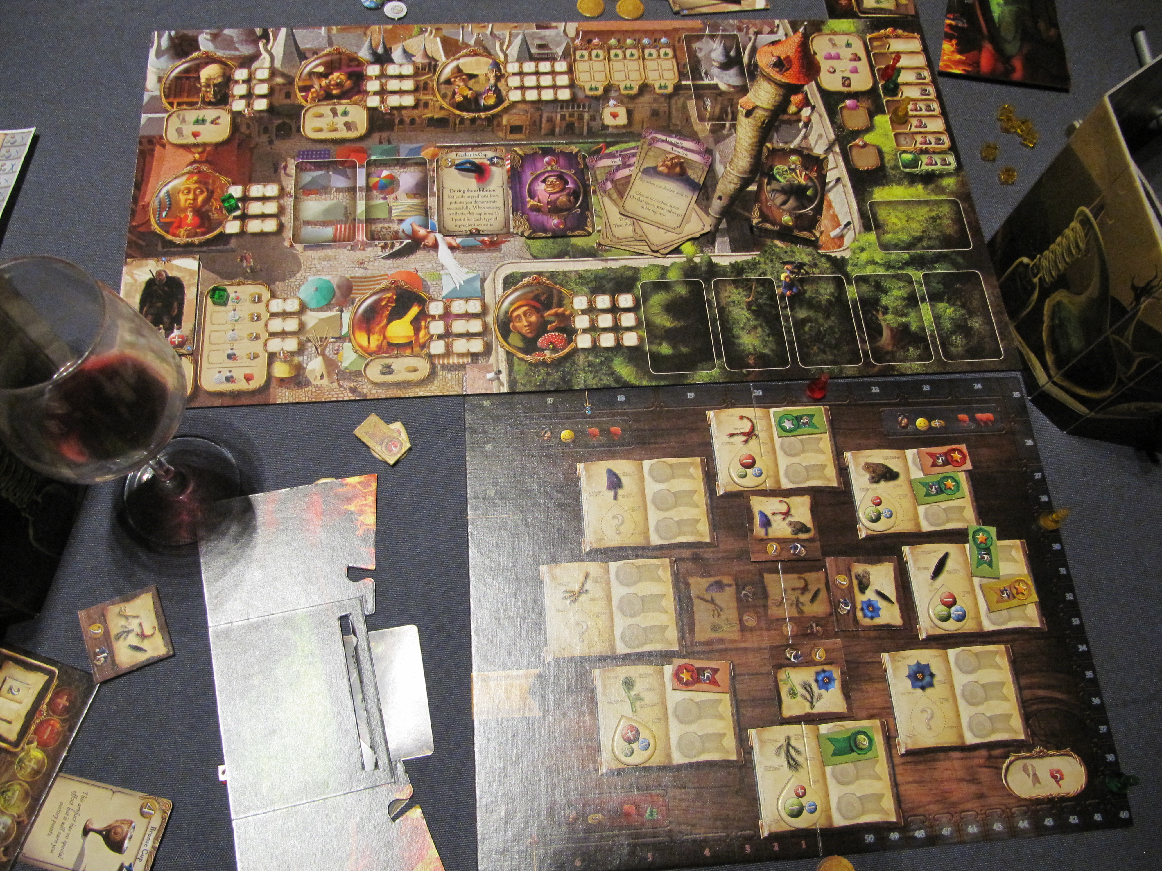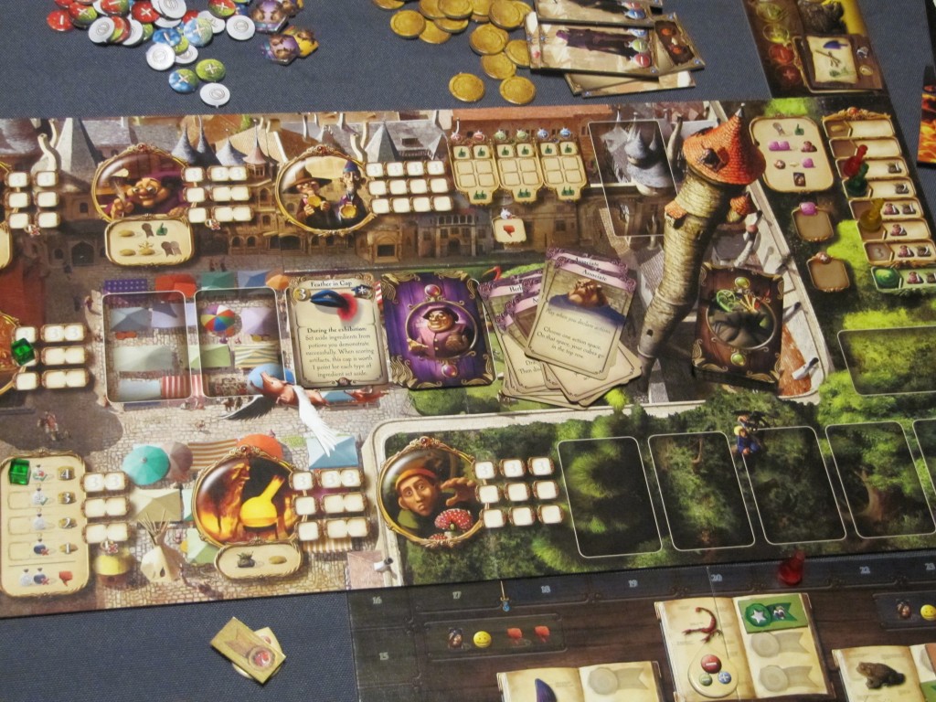 Waoh ! En voilà du matériel ! un magnifique plateau et des cartes avec de très belles illustrations, des paravents individuels très étranges, des petites fioles de potion comme pion joueur, un autre plateau, d’autres plus petits pour chaque joueur, des cubes, des jetons… Enfin, du contenu, il y en a !