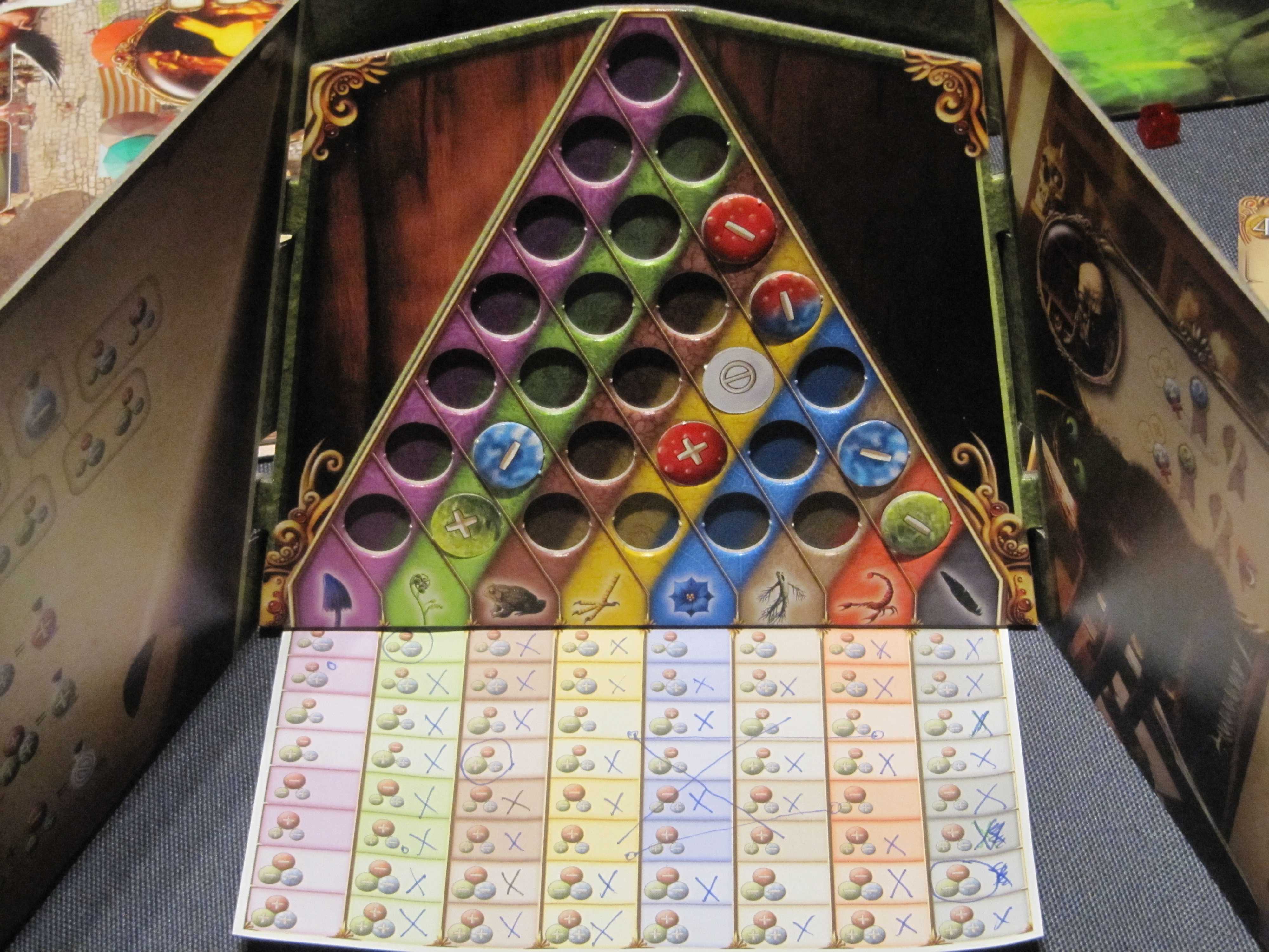 Pour les chimistes mathématiciens d’abord car vous allez mixer des codes génétiques de 2 ingrédients (des racines, des crapauds, des plantes, des pattes de poule, des plumes, des scorpions et des champignons) qui, selon une certaine équation, vont donner un des 7 résultats possibles.  Ce résultat va vous donner une indication sur le code génétique probable des 2 ingrédients mixés  (A noter que le résultat « neutre » est celui qui donne le moins d’indications et qui peut être très frustrant d’obtenir car, non seulement il est le fruit du hasard, mais il peut vous handicaper par rapport aux autres joueurs qui disposent de plus d’informations que vous et prennent une avance sur vous très difficile à rattraper).