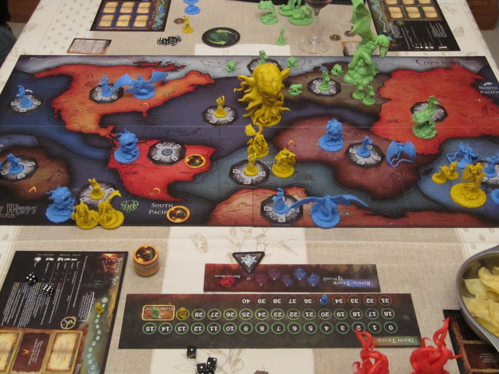 Mais tout ce matériel serait inutile si le jeu n’était pas à la hauteur.  Après l’explication des règles, on se demande tout de même pourquoi avoir fait des figurines aussi monstrueusement grandes.  N’est-ce pas un attrape nigauds ?  Je dirais oui et non.  Oui car on aurait aussi pu avoir un pion en carton plat à la place ( 😀 ).  Non car ça en jette 😉  Et ces figurines représentent notre Great Old One, c’est pas rien, un truc super monstrueux, un bazar de ouf, que quand vous le déplacez sur une zone ennemie, celui-ci a peur.  Oui, prendre cette figurine immense et la déplacer dans un zone par un bruit lourd de terreur, ça a un sens ! 😀