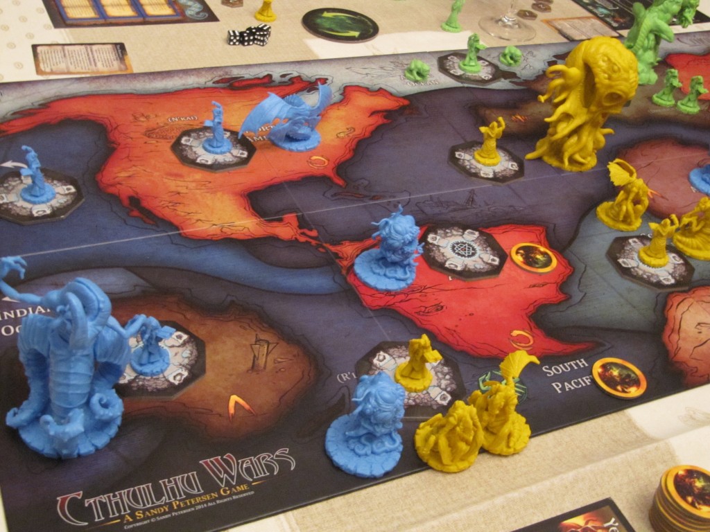 Un peu comme Risk ou l’excellent Kemet, Cthlhu Wars est donc un jeu de combat assez simple, un peu trop peut-être car la tension en est absente, aux choix peu nombreux et faciles et à la stratégie limitée à du rentre dedans.  Ses figurines impressionnantes et sa simplicité donnent1037 Cthulhu W 4 pas mal de fun aux parties qui sont d’autant plus agréables qu’elles ne s’éternisent pas (1h30 de jeu, c’est parfait pour ce format).