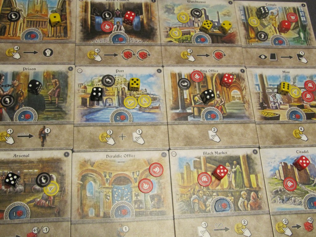 Achaia est un jeu qui allie les dés et la mécanique de placement d’ouvriers. C’est une mécanique qu’on a déjà rencontrée dans Marco Polo entre autre. La particularité ici est que les dés restent sur place du début jusqu’à la fin de la partie, sauf dans un cas précis (qui arrive régulièrement). Et cela fonctionne bien.