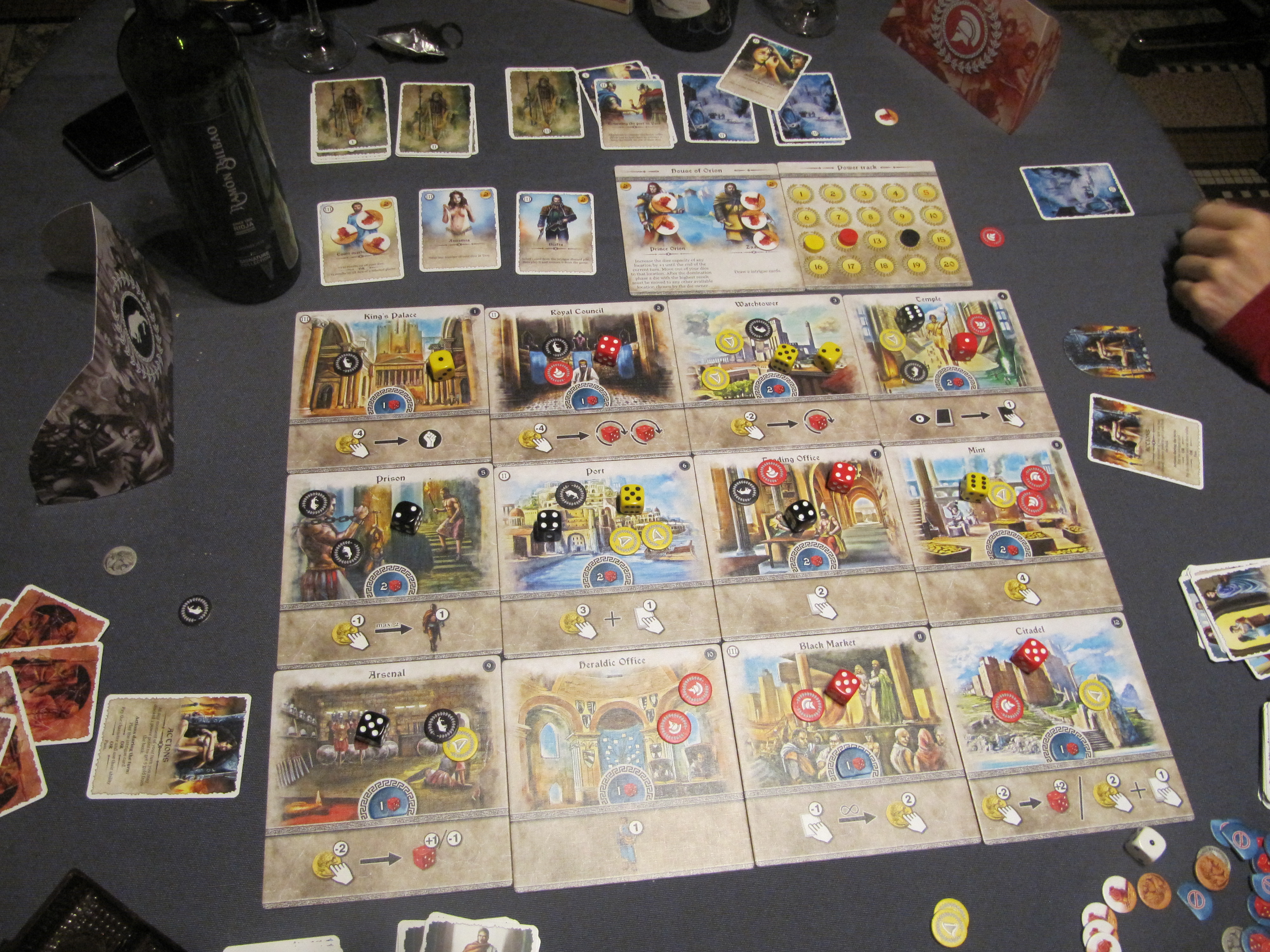 Au début du premier tour de jeu, vous pouvez placer 3 de vos dés sur les tuiles, en respectant les capacités maximales de chacune d’elles. Au début du second et troisième tour de jeu, vous pourrez placer vos 4ème et 5ème dé. Elément intéressant : 2 des lieux fermés en début de partie s’ouvrent en début de 2ème tour et 2 autres au début du troisième tour.