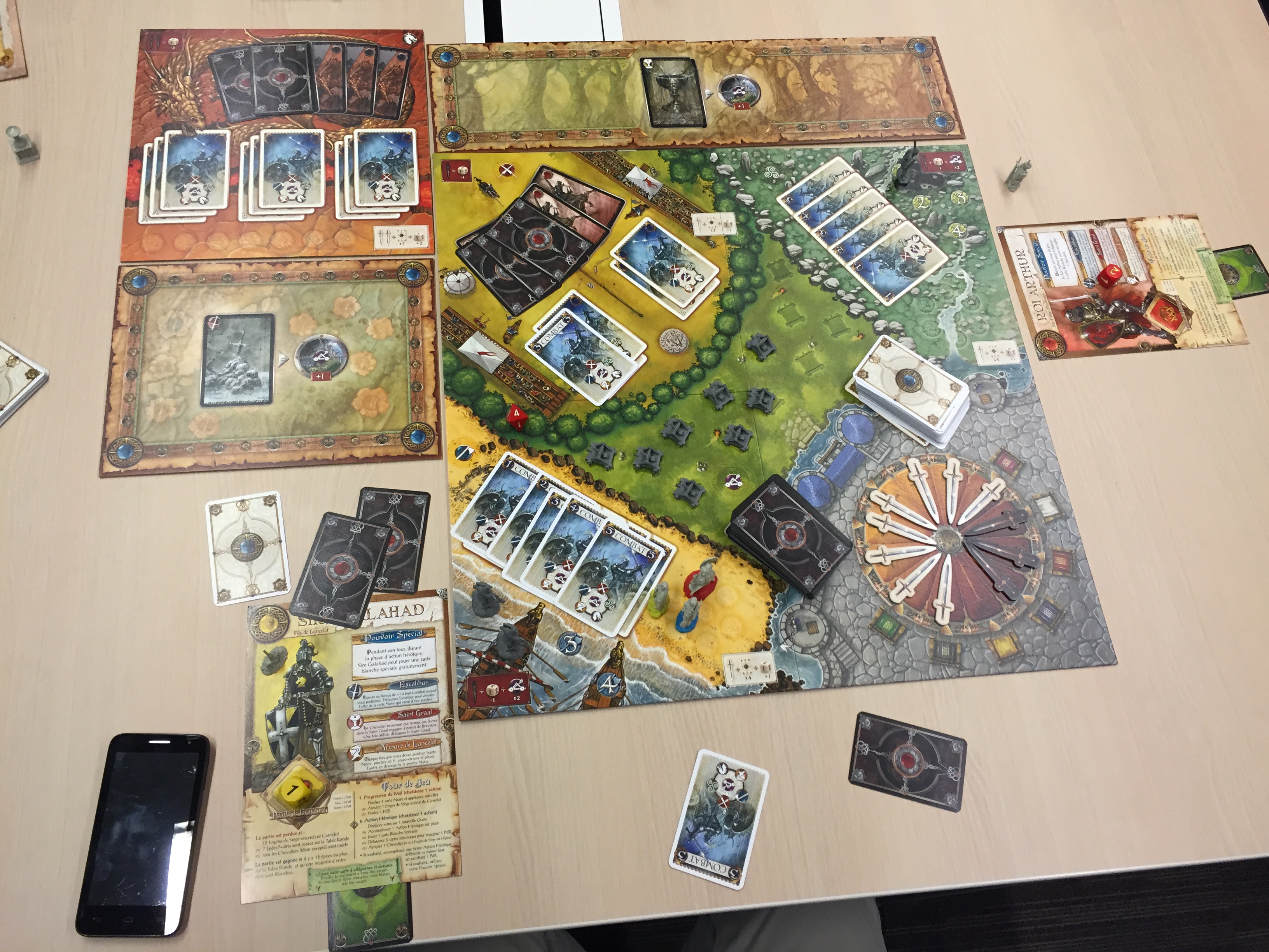 Pourtant, Serge Laget et Bruno Cathala ont fait un bon jeu.  Les joueurs jouent contre le jeu et vont tenter de réussir différentes quêtes avant que le jeu ne les gagne.  Il va falloir accepter d’en perdre l’une ou l’autre car on ne peut pas être sur tous les fronts en même temps.  Les quêtes se réussissent lorsqu’on arrive à jouer certaines combinaisons de cartes : des full, des suites, des doubles paires, des brelans,…  Pour cela, il va falloir piocher un maximum de cartes pour être blindé lorsqu’on affrontera les forces du mal.  Cette réalisation de quête est non seulement assez abstraite mais également assez répétitive et peut s’avérer assez monotone par moment.