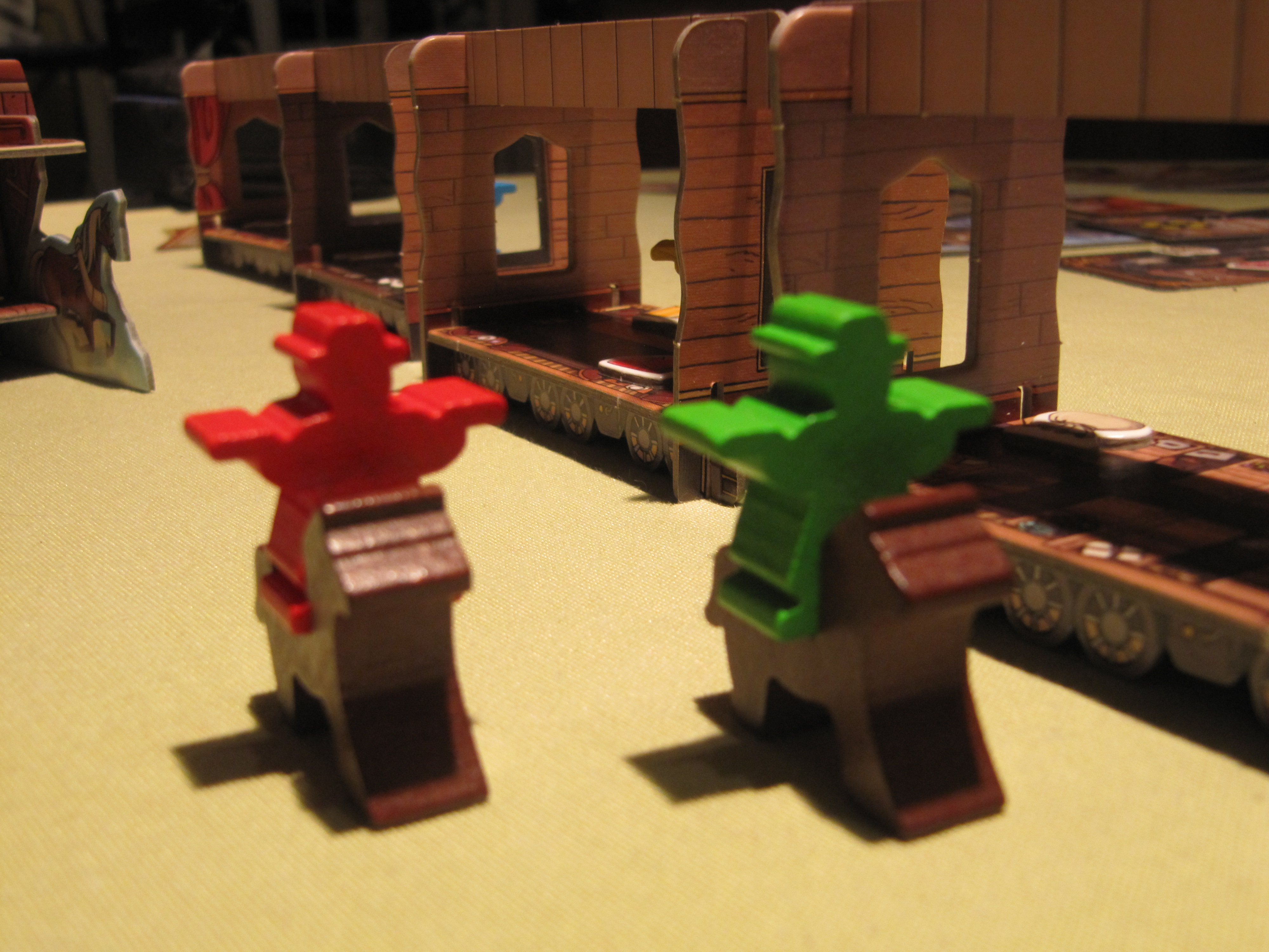 -L’autre règle qu’on oublie facilement est qu’on prend un otage la première fois qu’on met les pieds dans la diligence. Rien ne le rappelle (aucun pictogramme sur la diligence) et ça ne colle pas super au thème. Si au moins les otages avaient été représentés par des pions, on aurait pu facilement se rappeler qu’on devait prendre un otage avec soit, en plus, le pion otage aurait pu alors accompagner le cowboy. Mais là, rien ! En plus, vous imaginez-vous sautant sur la diligence, prenant un otage, montant sur le toit de la diligence puis assommant le gardien pour lui piquer sa valise, puis sautant sur votre
