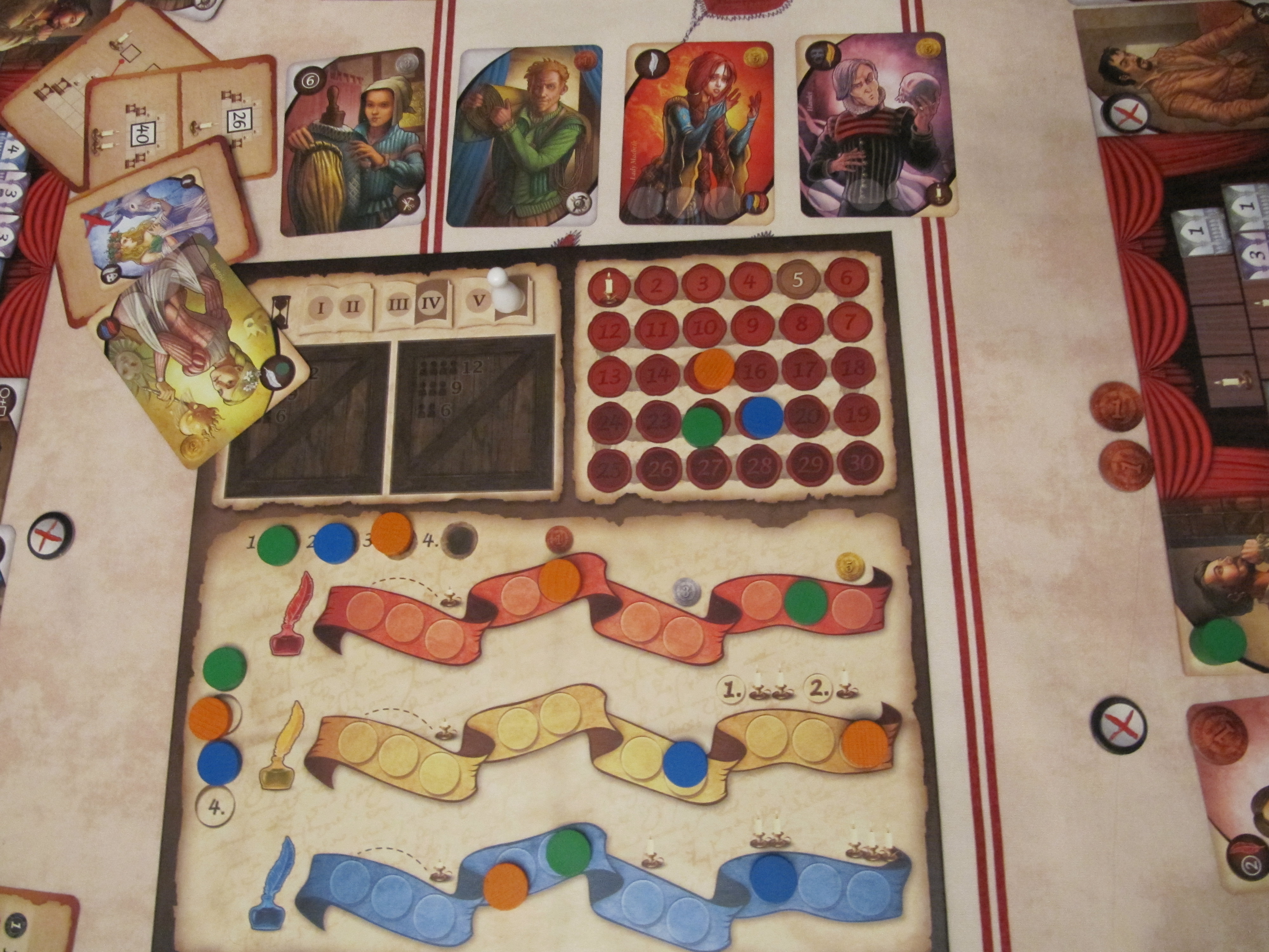 Un peu comme dans Five Tribes, la première phase de Shakespeare est une phase d’enchère à l’envers qui va déterminer l’ordre du tour. A l’envers car c’est le joueur qui aura misé le moins de jetons d’action qui sera premier joueur. En contrepartie, il ne pourra jouer qu’avec le nombre de jeton d’action misé. Les joueurs disposent de 5 jetons d’action et vont donc en réaliser maximum 5 s’ils misent tous leurs jetons.